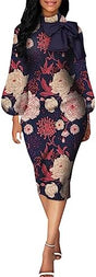 BestGirl Women's Bishop Sleeve Bodycon Dresses Work Casual Floral Print Pencil Midi Dresses