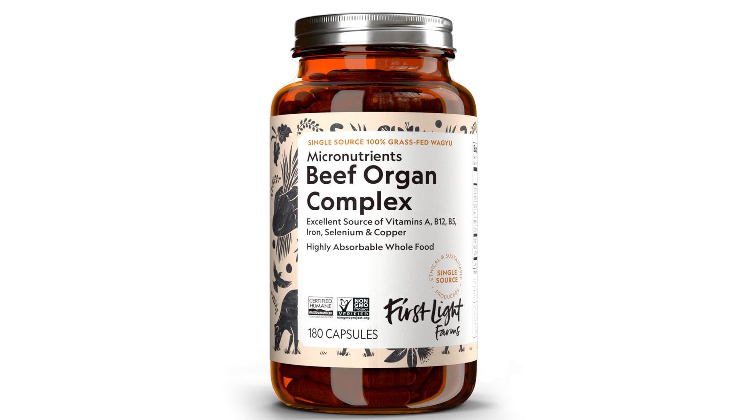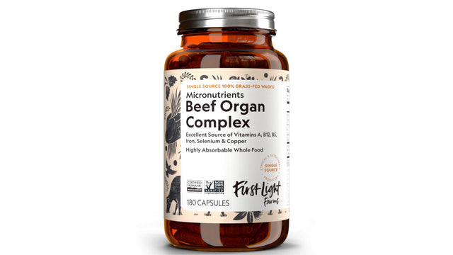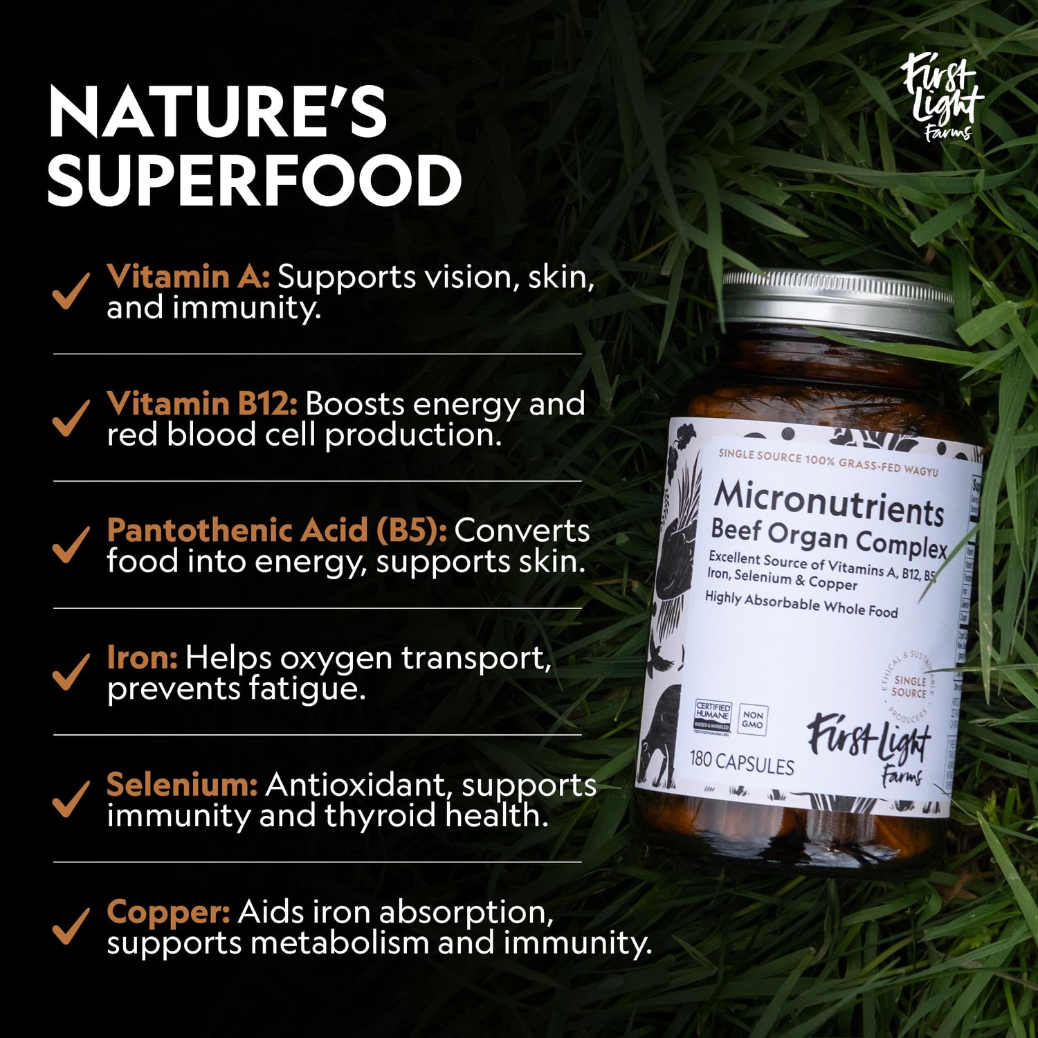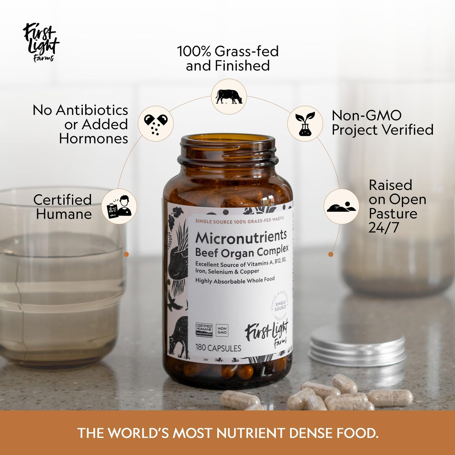 First Light Farms Freeze-Dried Wagyu Beef Organ Supplement Grass-Fed | 180 Capsules | Whole Food Nutrition with Liver, Heart, Kidney & Spleen | Beef Organ Complex, Certified Humane