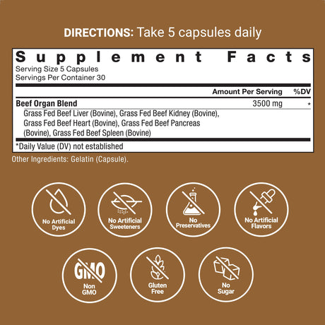 Containing liver, heart, kidney, spleen, pancreas, lungs, and brain, this supplement is nutrient-dense and grass-fed. It supports mental clarity, vitality, and overall wellness, making it ideal for carnivore or nutrient-focused diets. Capsules are easy to take daily.