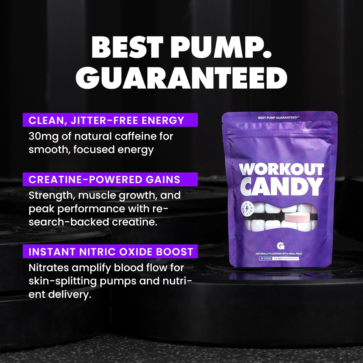 - WORKOUT CANDY: Introducing a powerful combination of creatine, whole food derived nitrates, and herbal caffeine in a delicious, chewable candy. Our Workout Candy has a delicious sour candy taste and will help give you the power and energy you need to hit new goals in the gym.