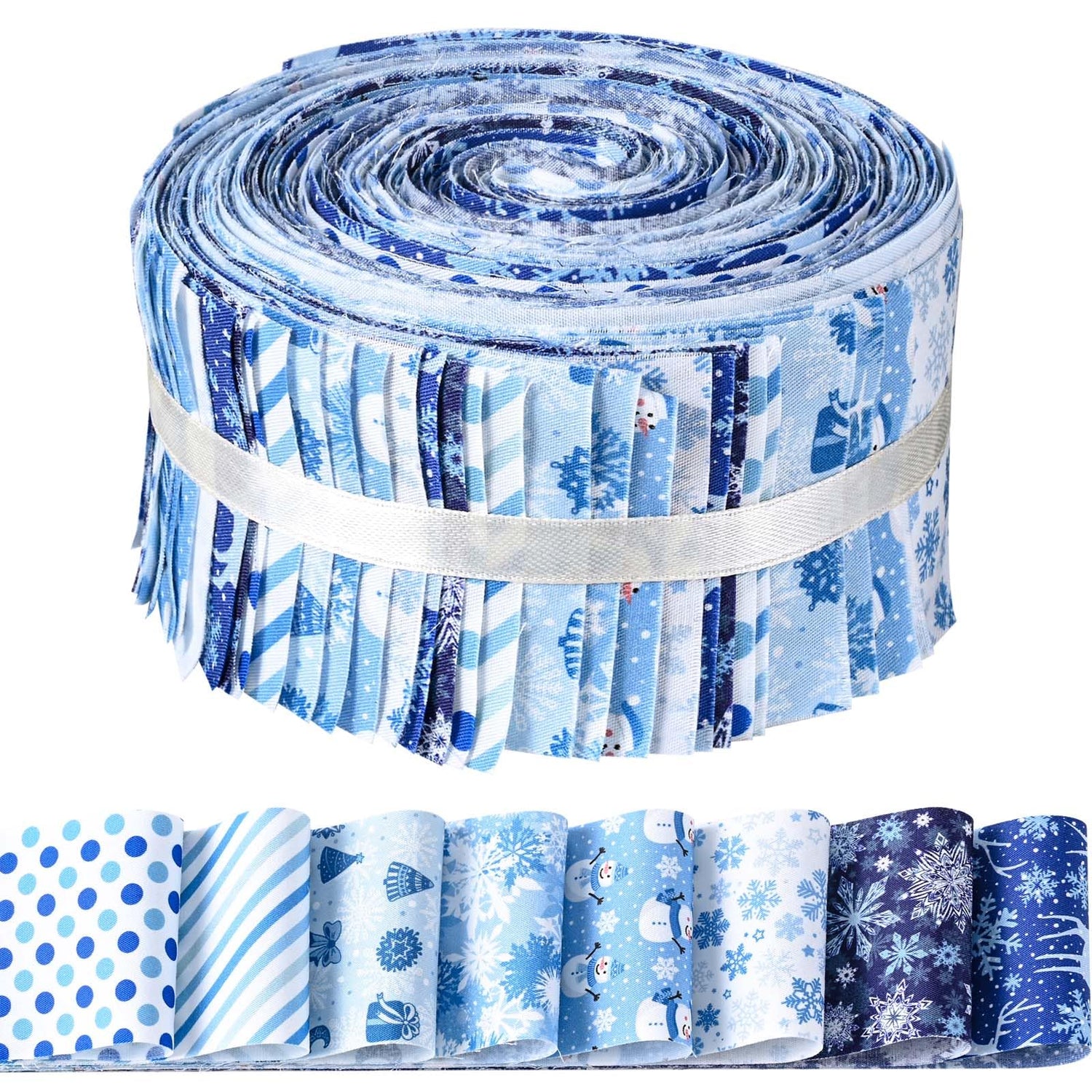 Details: 40 Pcs Winter Christmas Snowflakes Cotton Jelly Fabric Strips Blue and White Snowflake Reindeer Patchwork Strips for Quilting Crafting Snowman Precut Patchwork for Sewing DIY Crafts Cotton Fabric Bundles Strips