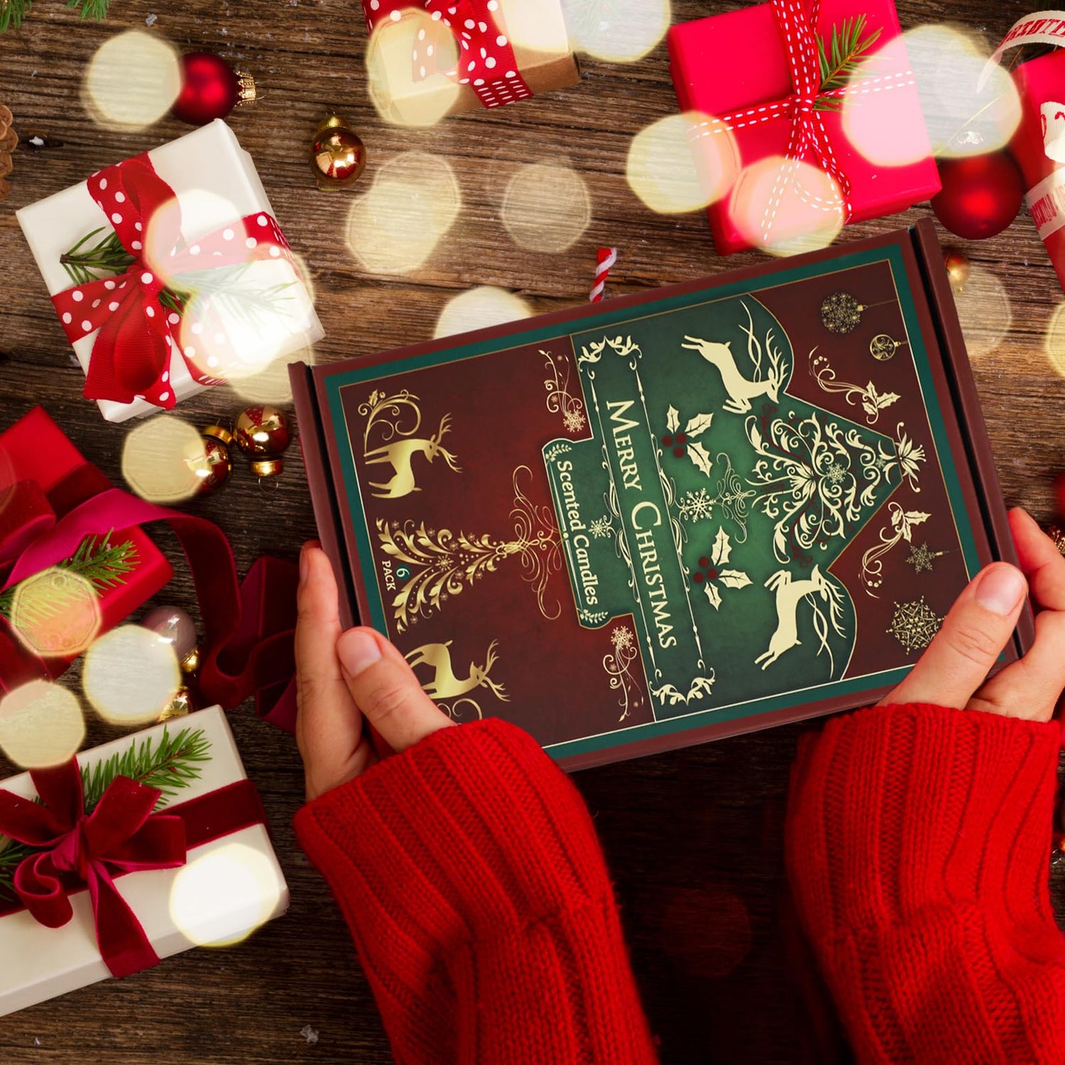 - Christmas Candle Gift Set: 6 pack 3.5 oz scented candles in a christmas gift box, Cinnamon Apple, Christmas Cookies, Vanilla, Fir and Cedarwood, Holiday Velvet Flames, Sahara Amber.