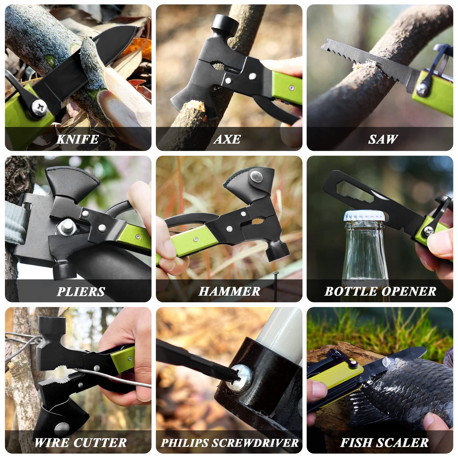 - 14-in-1 Multi Tool Axe: Features Axe, Knife, Pliers, Saw, Hammer, Wrenches, Screwdrivers, Bottle & Can Opener, File, etc.