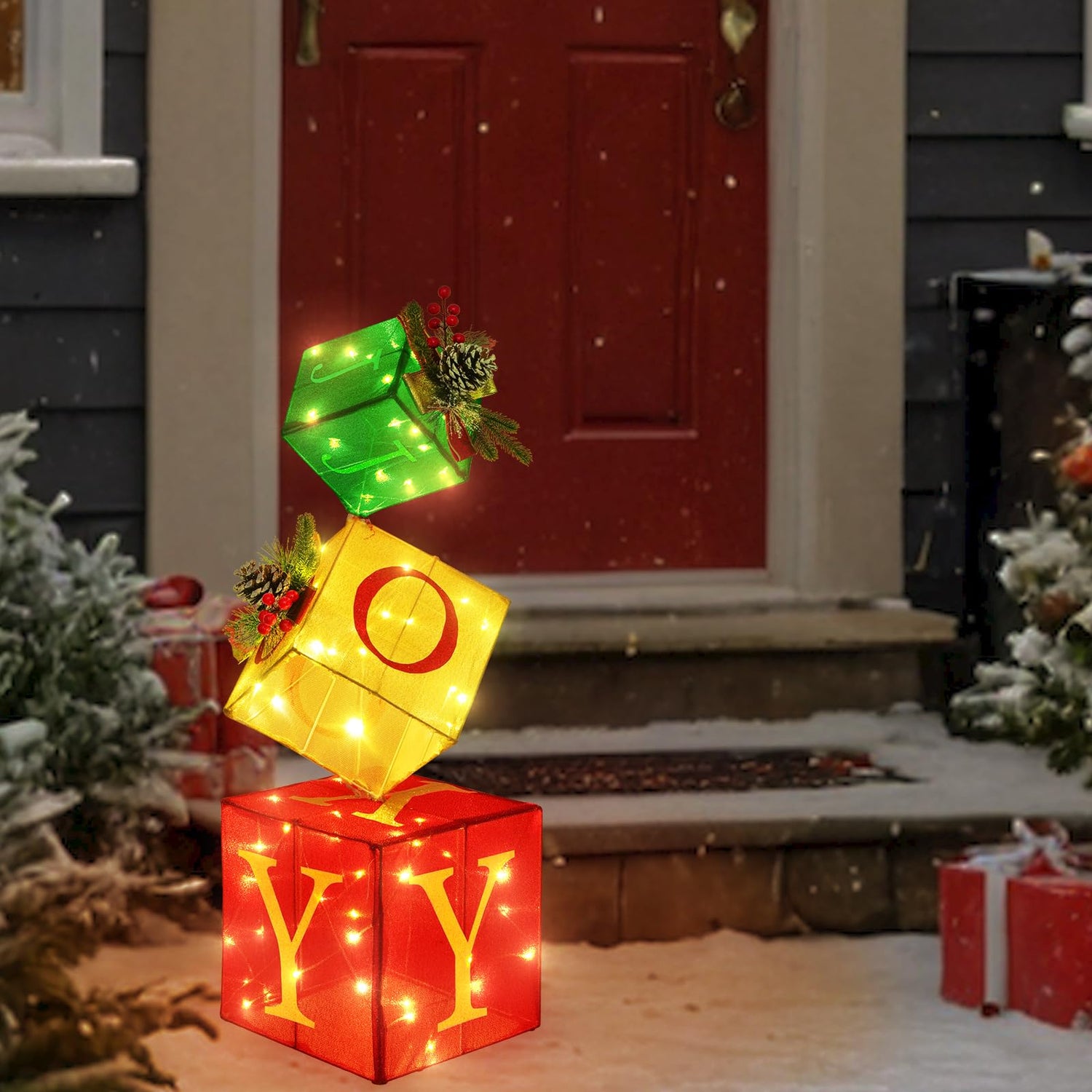 COVFEVER Christmas Joy Lighted Gift Boxes Decorations Set of 3, 2.6Ft Stackable Christmas Nesting Boxes Battery Operated for Home and Party Decoration