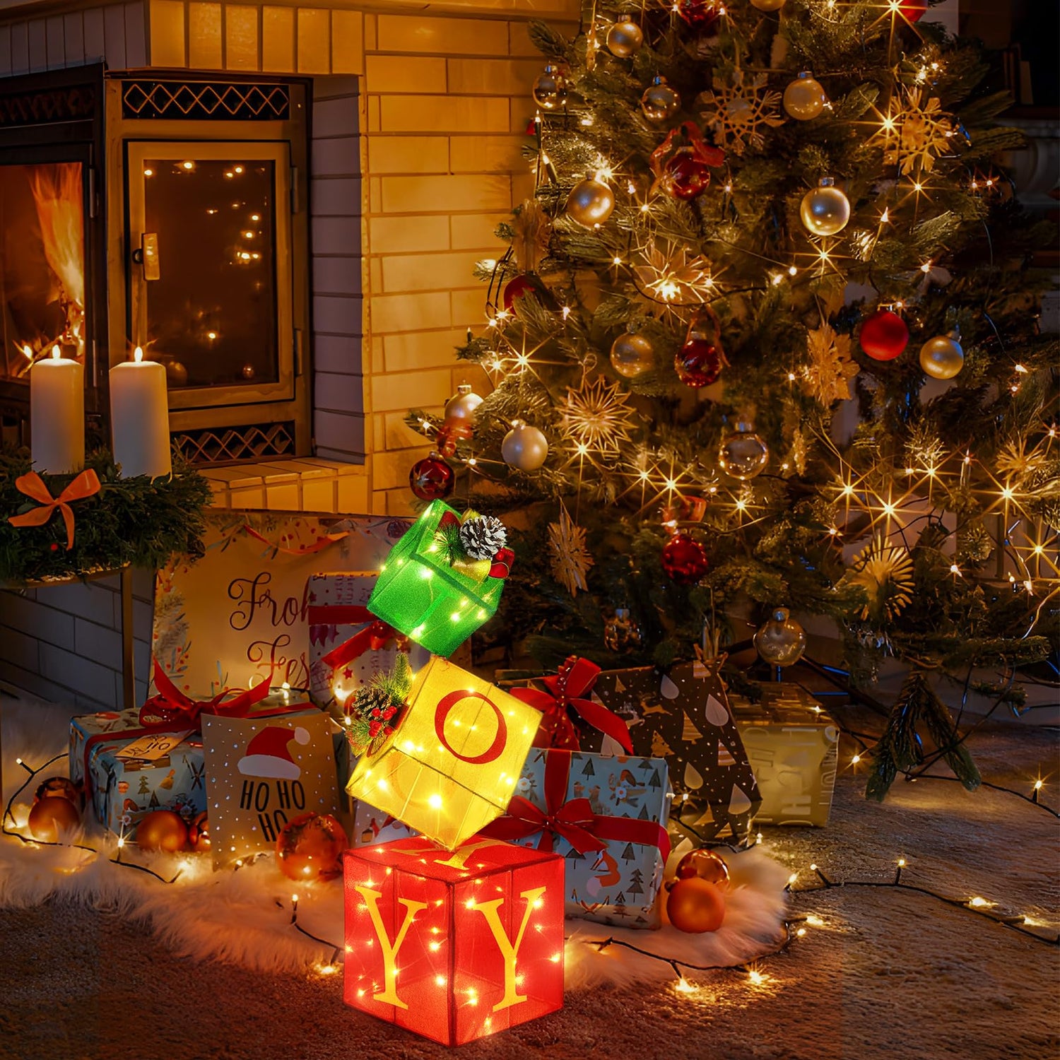 - Versatile Holiday Display: These lighted gift boxes offer 2 arrangement options - display side-by-side or stack up to 2.6ft tall. Perfect for tabletops, mantels & parties, they bring festive cheer with warm glowing lights. Set of 4 beautifully decorated boxes for stunning holiday decor