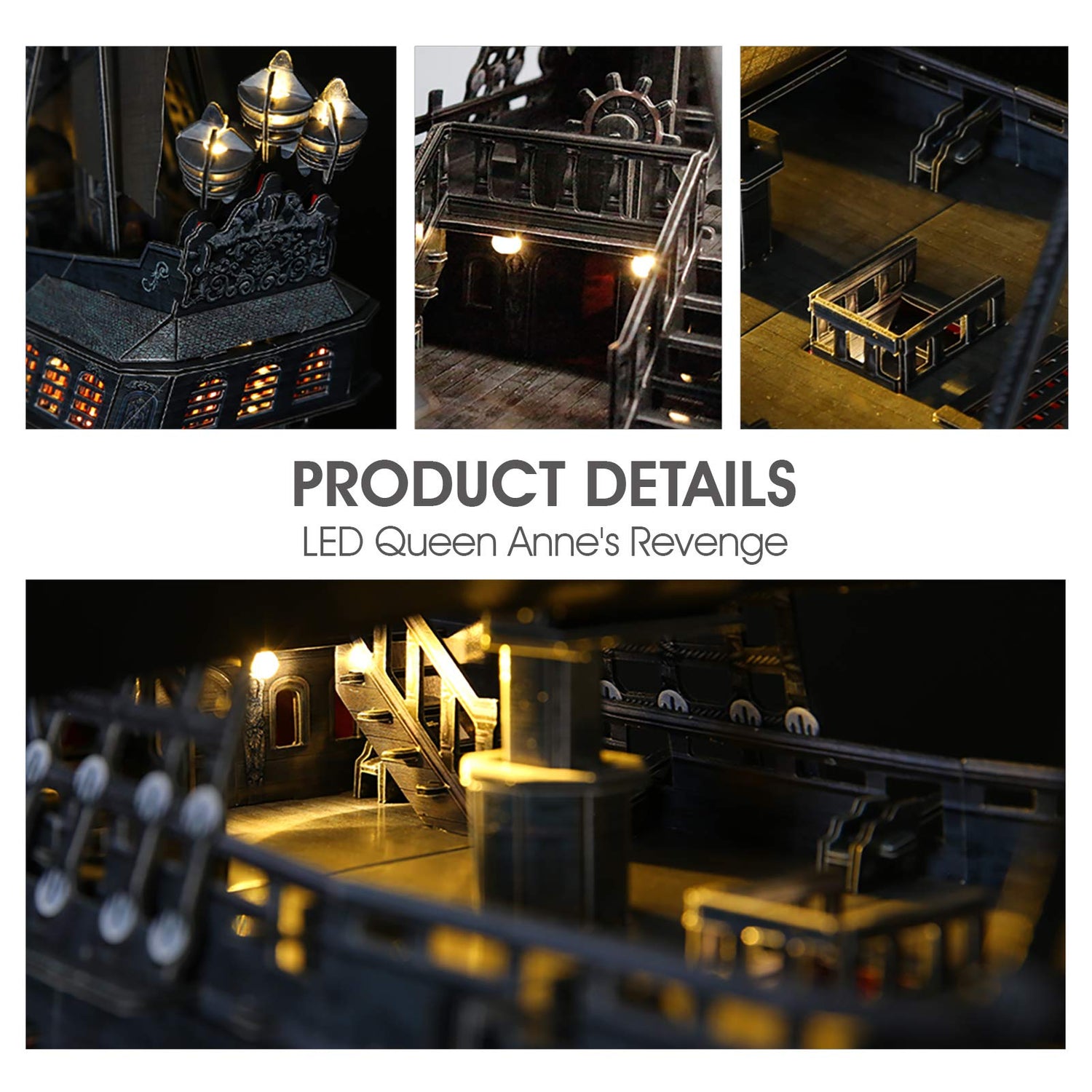- EMBARK ON A PIRATE ADVENTURE: Set sail with our 3D Queen Anne’s Revenge Puzzle. This pirate ship model, standing an impressive 25.2 inches tall and made up of 340 pieces, becomes a thrilling adventure, especially with 15 warm LED lights that bring it to life at night. You’d never guess it's made from foam board - it's a striking addition to any collection