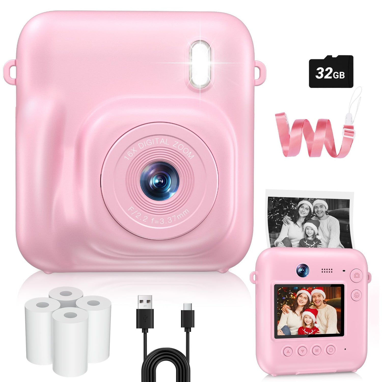 - [Upgraded Print Instant Camera] The 3-in-1 dual-lens digital camera for kids mainly includes black and white printing, color storage, photography, and video recording! This instant print camera can take selfies during festivals or travels, capturing beautiful moments. Kids camera can quickly print black and white photos in just 1 second. A 32GB card can also store over 2500 color photos, making it convenient to print anytime and anywhere.