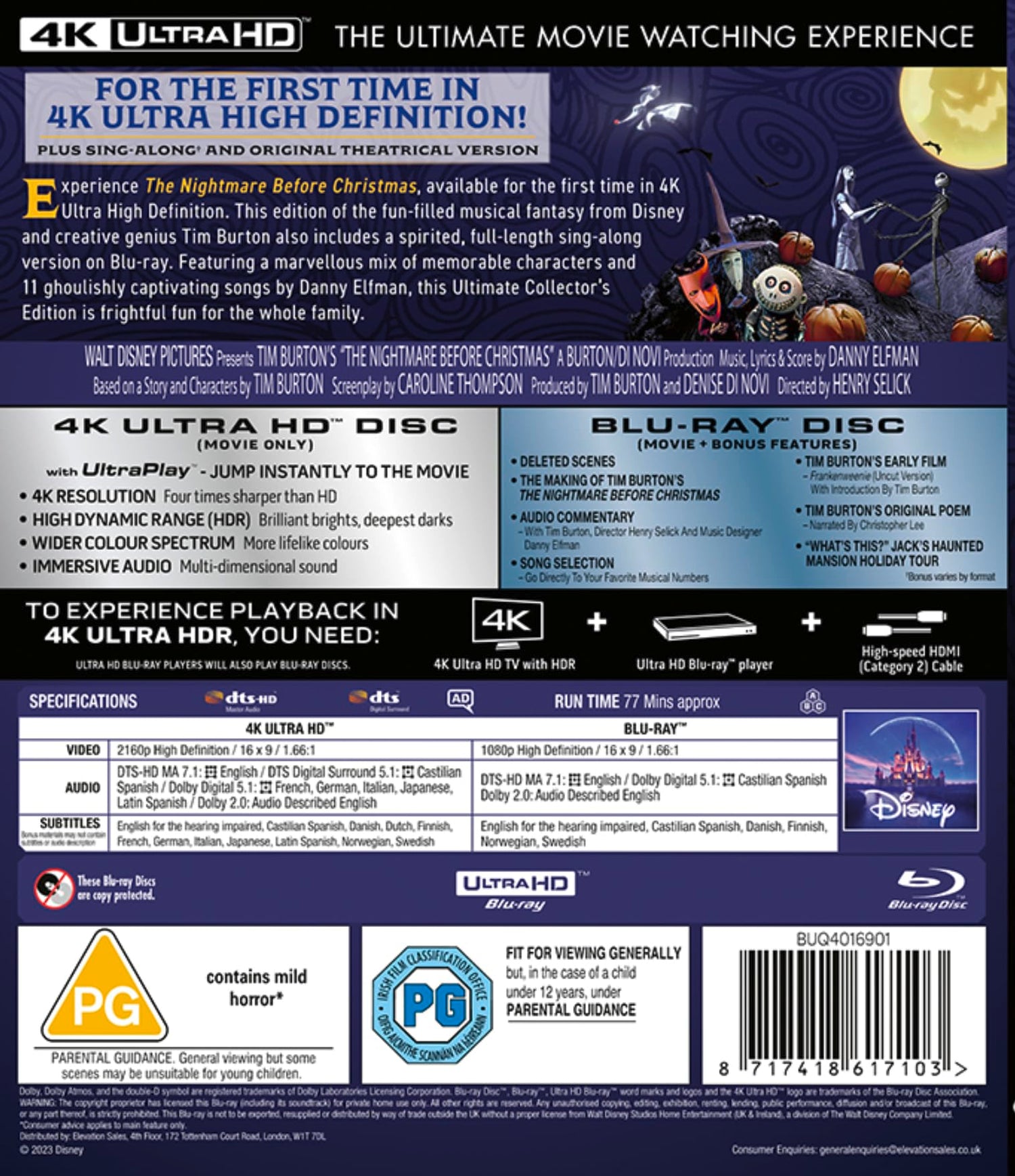 Details: Experience The Nightmare Before Christmas, available for the first time in 4K Ultra High Definition. This edition of the fun-filled musical fantasy from Disney and creative genius Tim Burton also includes a spirited, full-length sing-along version on Blu-ray. Featuring a marvellous mix of memorable characters and 11 ghoulishly captivating songs by Danny Elfman, this Ultimate Collector’s Edition is frightful fun for the whole family.