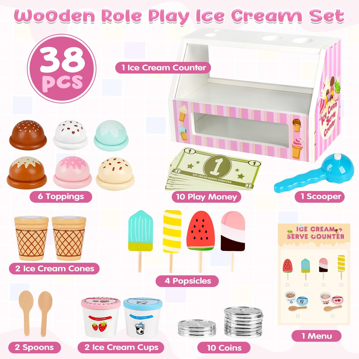 Dreamon Ice Cream Counter Playset for Kids, 38 PCS Wooden Ice Cream Set Shop for Toddlers 3-5, Toddler Pretend Play Toy, Christmas Birthday Gift for Boys and Girls