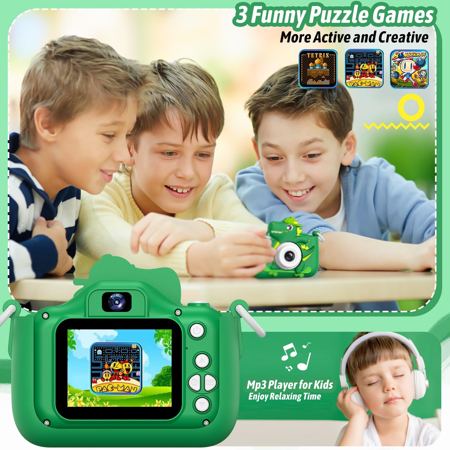- 【Specially Upgraded Design for Children】Upgraded to dual-camera configuration, Easy to take selfies. Just open the switch key to enjoy the fun of taking photos. The cute cartoon silicone casing provides the kids camera with nti-drop design, allows kids to enjoy happy and freedom photography moments without worries of broken. The camera for kids also specially designed a durable lanyard for portability, children can hang the camera on their neck.
