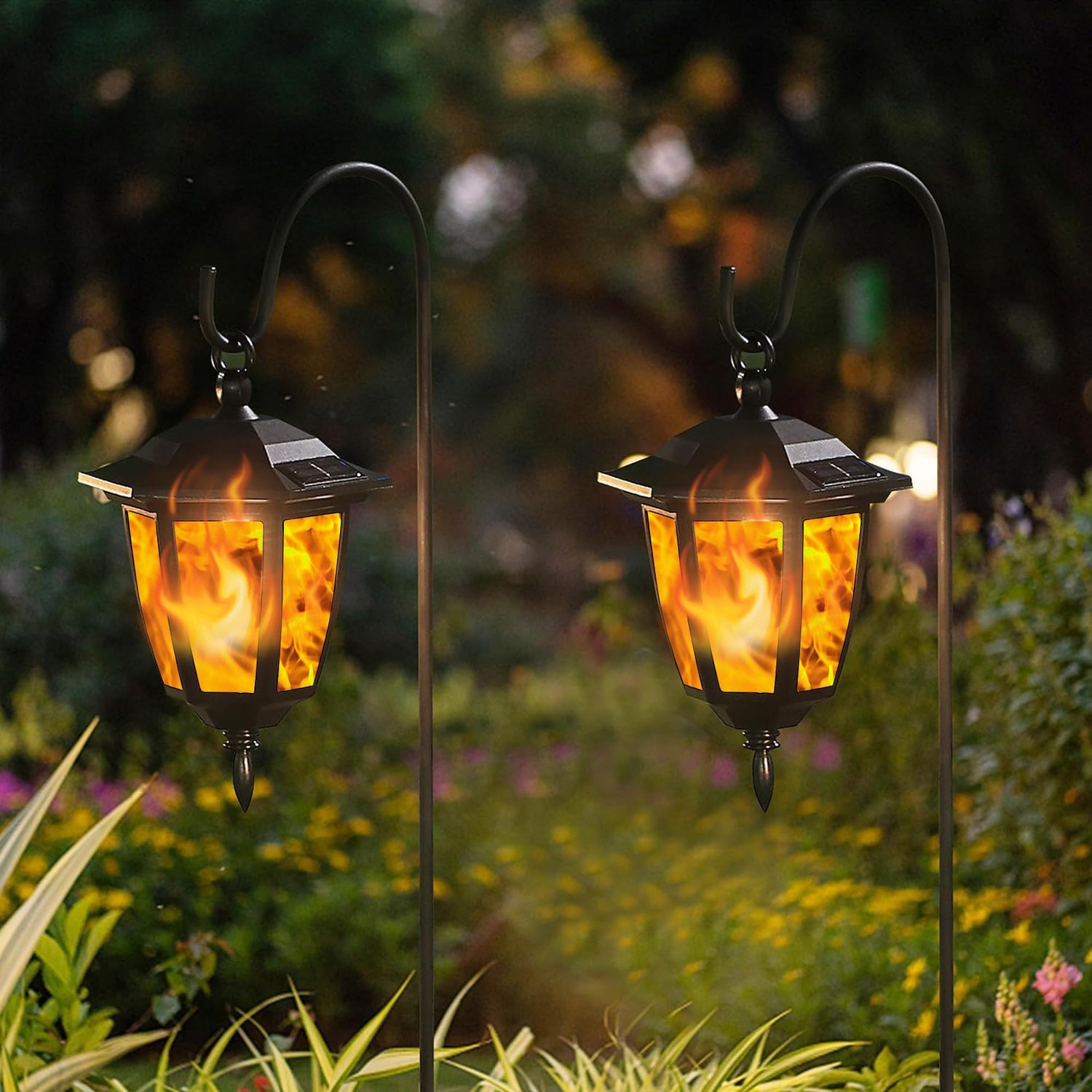 Dynaming 2 Pack Solar Flame Hanging Lights Outdoor, Halloween Solar Flickering Flame LED Garden Lanterns with 2 x 38 Inch Shepherd Hooks, Christmas Lighting for Lawn Patio Yard Pathway Driveway