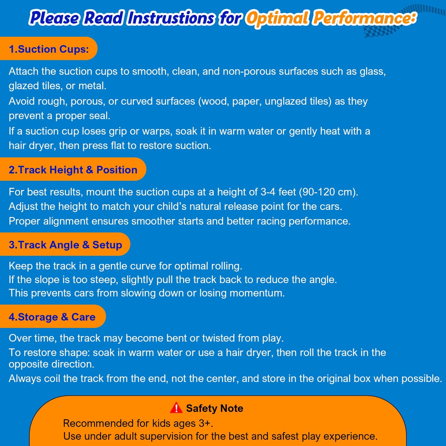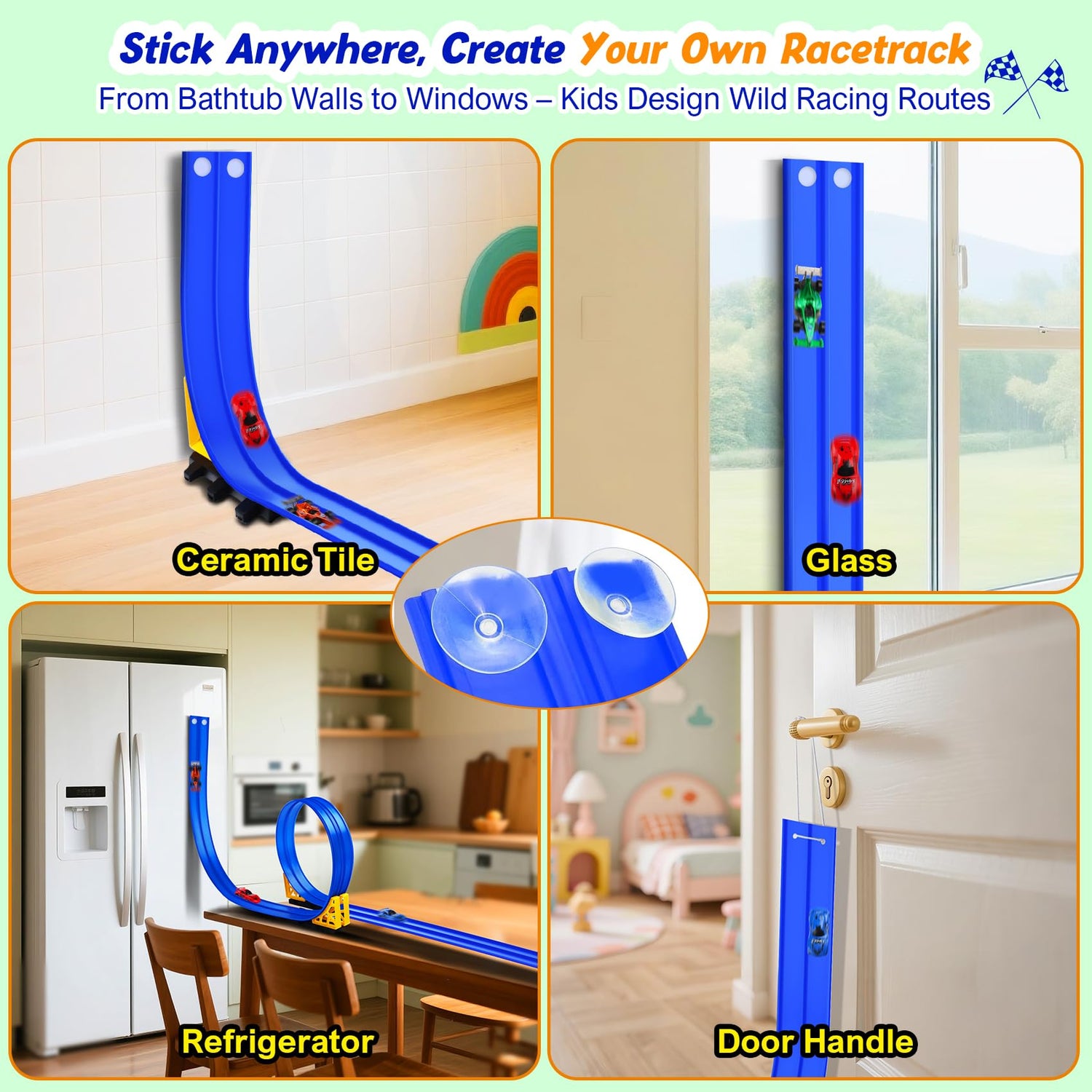 - 【Build Anywhere, Endless Fun】 Designed for kids ages 3+, this 15ft flexible race car track with suction cups lets little racers create tracks on bathtubs, windows, tiles, and even refrigerators! Say goodbye to boring flat racetracks—kids can finally race cars on walls, stairs, and smooth park benches for an exciting new playtime experience.