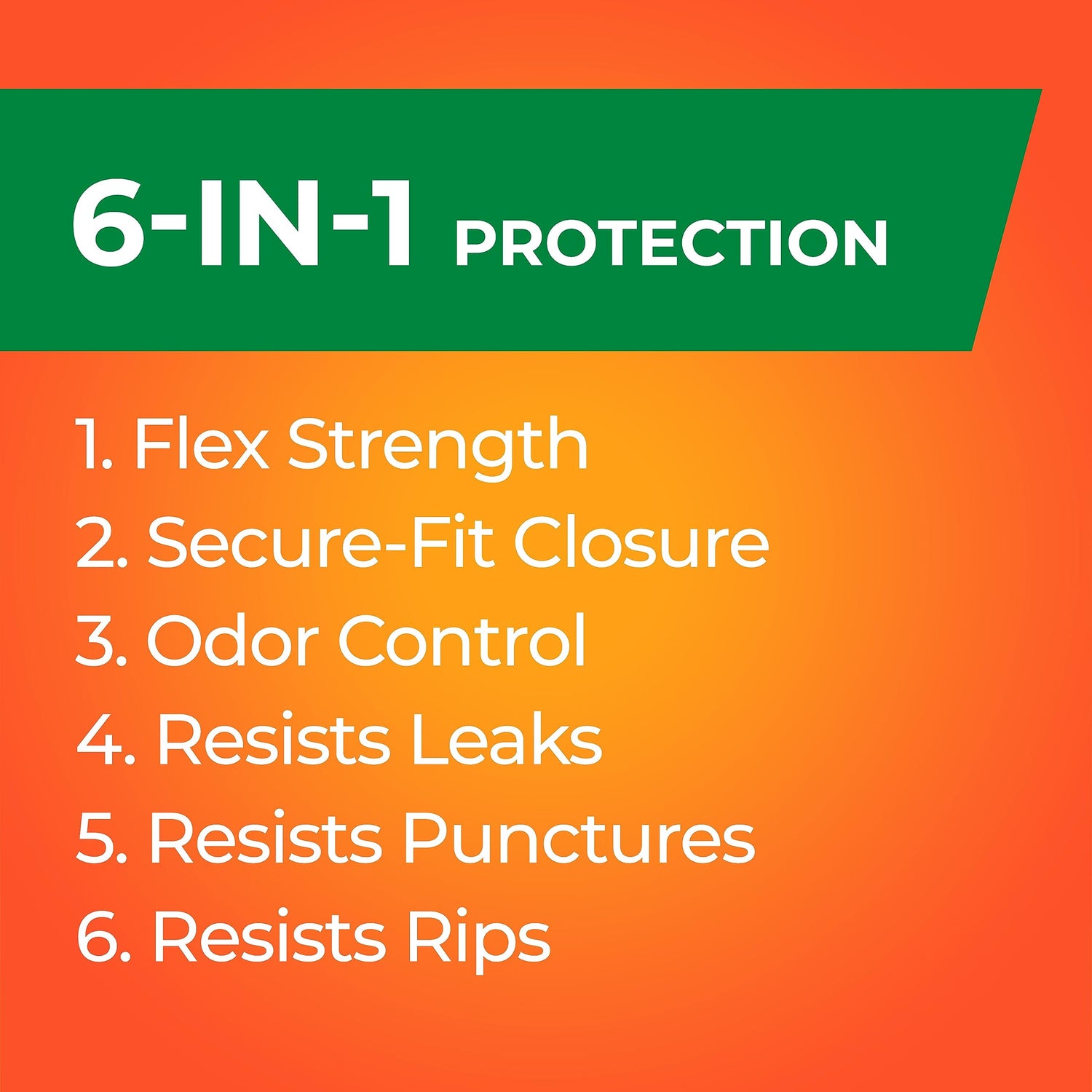 - 6-IN-1 Protection: Flexible scented large trash bags are made from coastal and reclaimed plastic and offer 6 points of protection to keep garbage where it belongs: flex strength, tough drawstring, odor control, and resistance to leaks, punctures, and rips