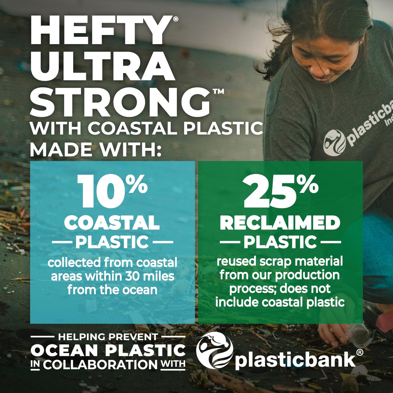 Details: Hefty Ultra Strong 13 Gallon Trash Bags made with 35% recovered materials including 10% coastal plastic* help you tackle cleanup jobs all around the house, thanks to their Hefty! Hefty! Hefty! strength and large capacity. Helping prevent ocean plastic in partnership with Plastic Bank, Hefty makes these tall trash bags using coastal and reclaimed plastic to provide the same Hefty strength and value you expect but now with an eco-friendly advantage. With 6-in-1 Protection, these tough Hefty 13 gallon trash bags offer flex strength, a tough drawstring, odor control, and resistance to punctures, leaks, and tears. The result is the highest protection available in flexible tall kitchen garbage bags. And that stretchy strength of Hefty trash bags means you don't have to worry about unexpected bag breakage and inconvenient messes when you take out the trash. With their Dependable Drawstring Closure, these large trash bags resist breakage and make transporting easy. Plus, these scented trash bags feature continuous odor control and a Seaside Breeze scent to keep unpleasant smells at bay. Count on these large drawstring 13 gallon trash bags for the strength and reliability you expect from Hefty. *10% coastal plastic, 25% reclaimed scrap material from our production process.