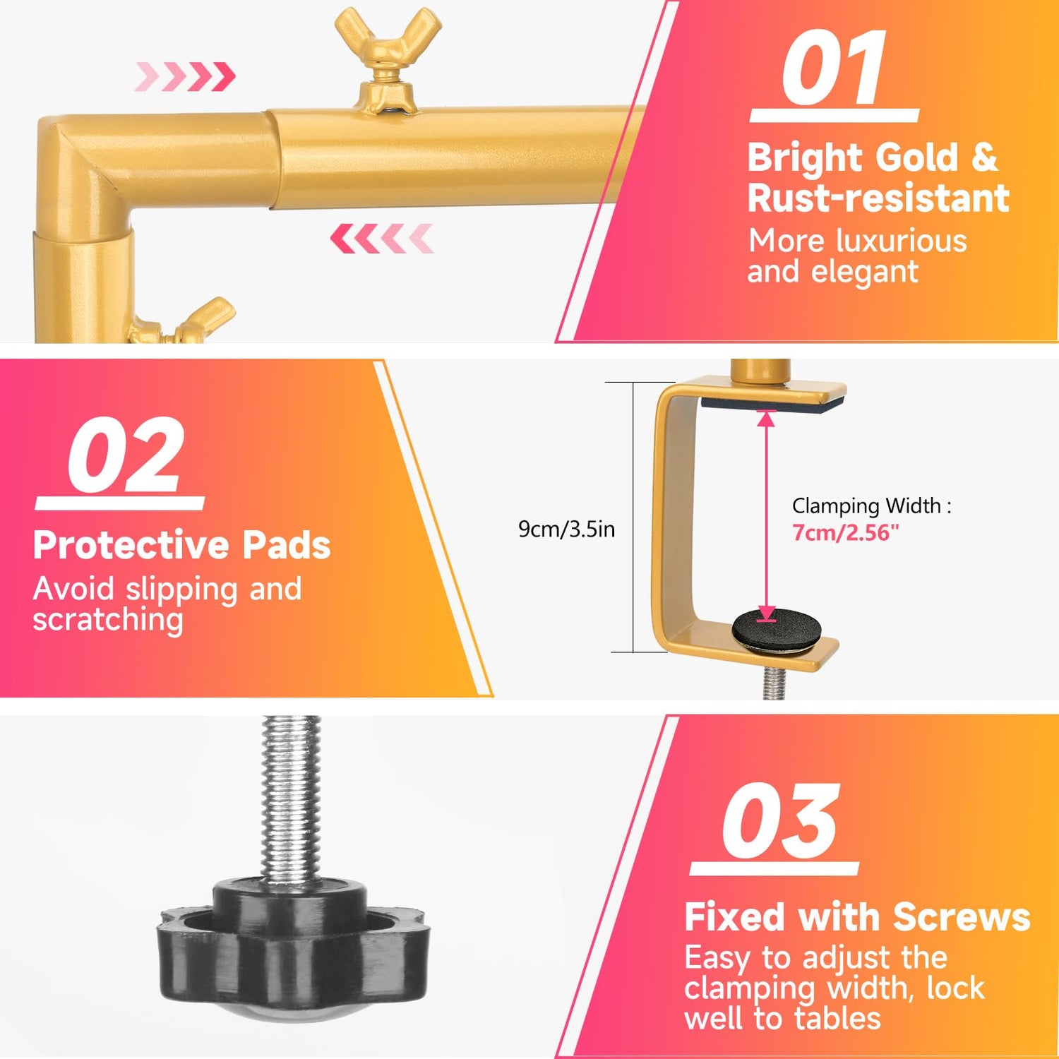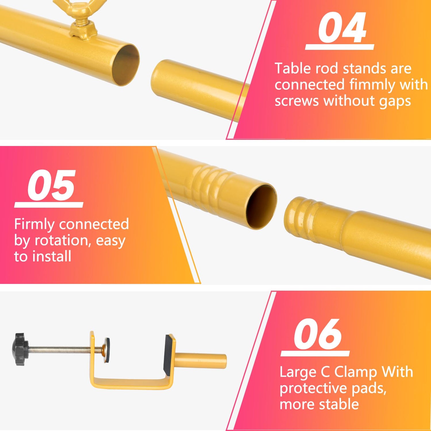 - Easy to Assemble: Table rod stand with clamps can be easy to assemble with screws. Clamp the over table rod onto the table, adjust and secure the screws according to the size of the table. Portable to space table arch stand anywhere at your will for indoor and outdoor use