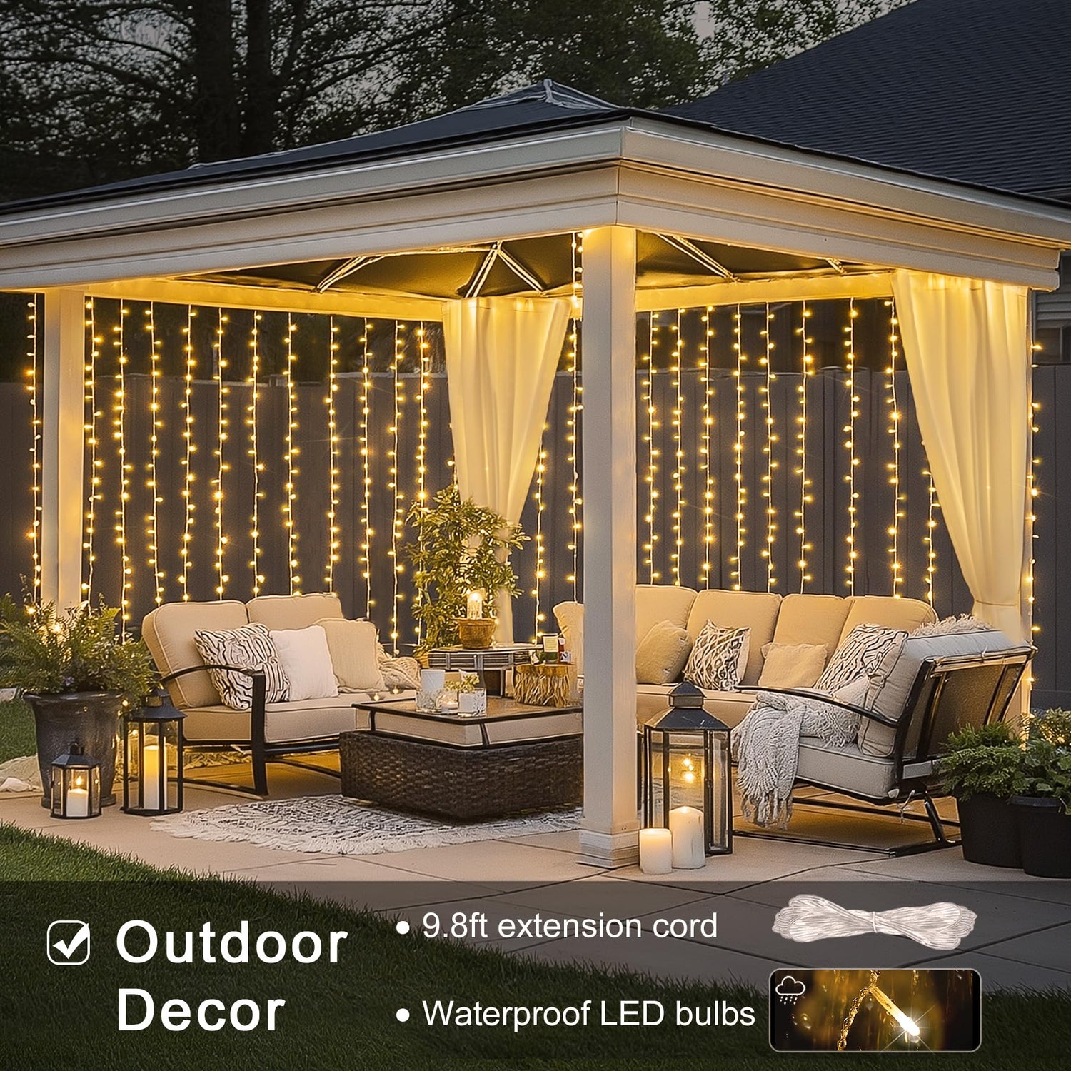 - 9.8x9.8ft 300 LED Curtain Lights(not connectable): The warm white LED fairy curtain lights feature 10 strings of lights, each with 30 LED bulbs. The 9.8x9.8 ft size is large enough to cover most windows and walls, creating a wider and more impressive lighting effect. The curtain lights are perfect for indoor and outdoor Christmas decorations, and will make your home shine! Please note that multiple sets of Christmas curtain lights cannot be connected.