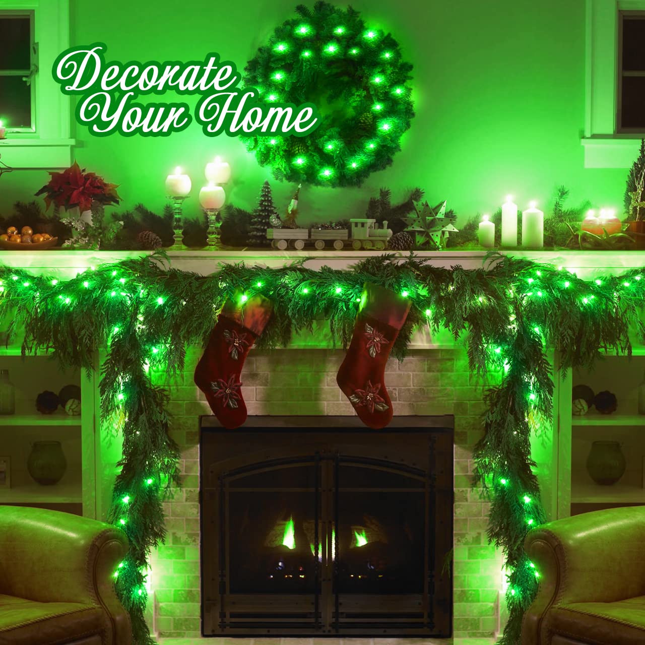 • 【Green Lights For Indoor&Outdoor Use】 The 33-foot-long green Christmas lights with 100 led bulbs are perfect for indoor and outdoor. Transparent wire can hide discreetly inside garlands, Christmas trees, Christmas tree and more. It can also be matched with any background, very suitable for room, wall, garden, porch, or adding a sparkling glow to your patio or balcony, making every corner full of Christmas atmosphere. You can plug the light away from where you need it with a 10-foot lead wire.