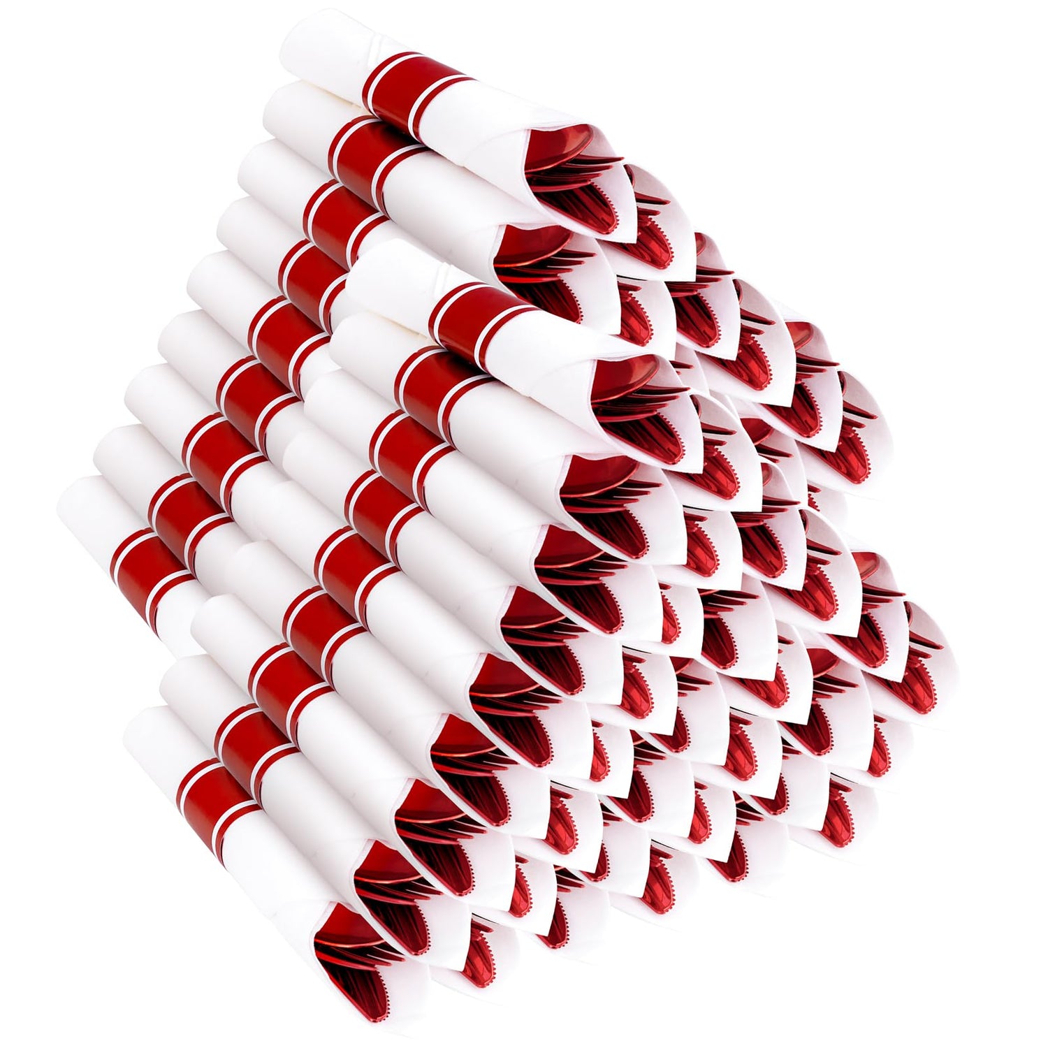 - Value Packaging: This is a large capacity packaging of red disposable flatware. The 100 pack includes 100 forks, 100 knives, 100 spoons, and 100 wrapped napkins. This wrapped disposable silverware set is perfect for large parties or weddings.