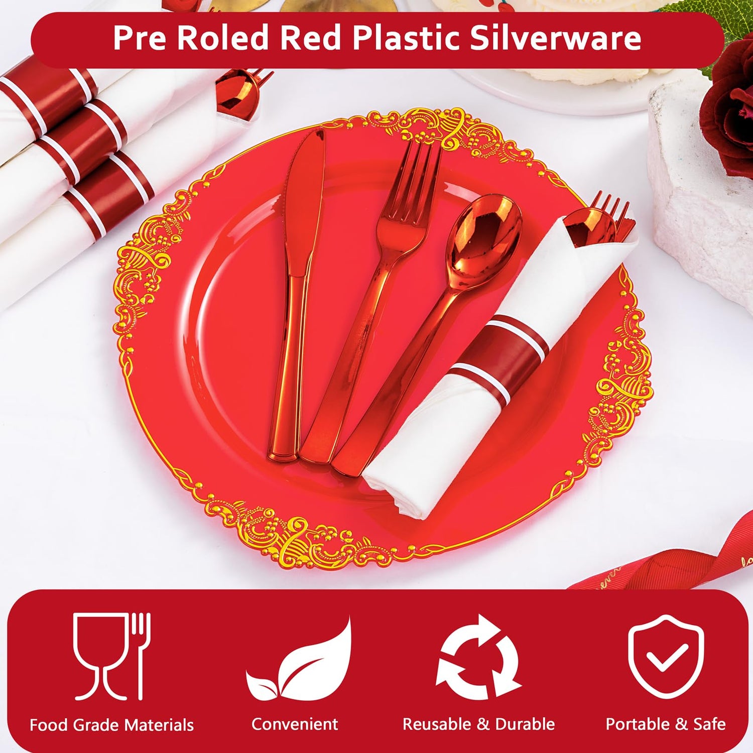 - Elegant and Convenient: The red plastic cutlery feel smooth and shiny, maintaining the standard of luxury you want. The rolled silverware disposable are very clear and convenient for you dinners. You can throw them away afterwards without having to wash them.