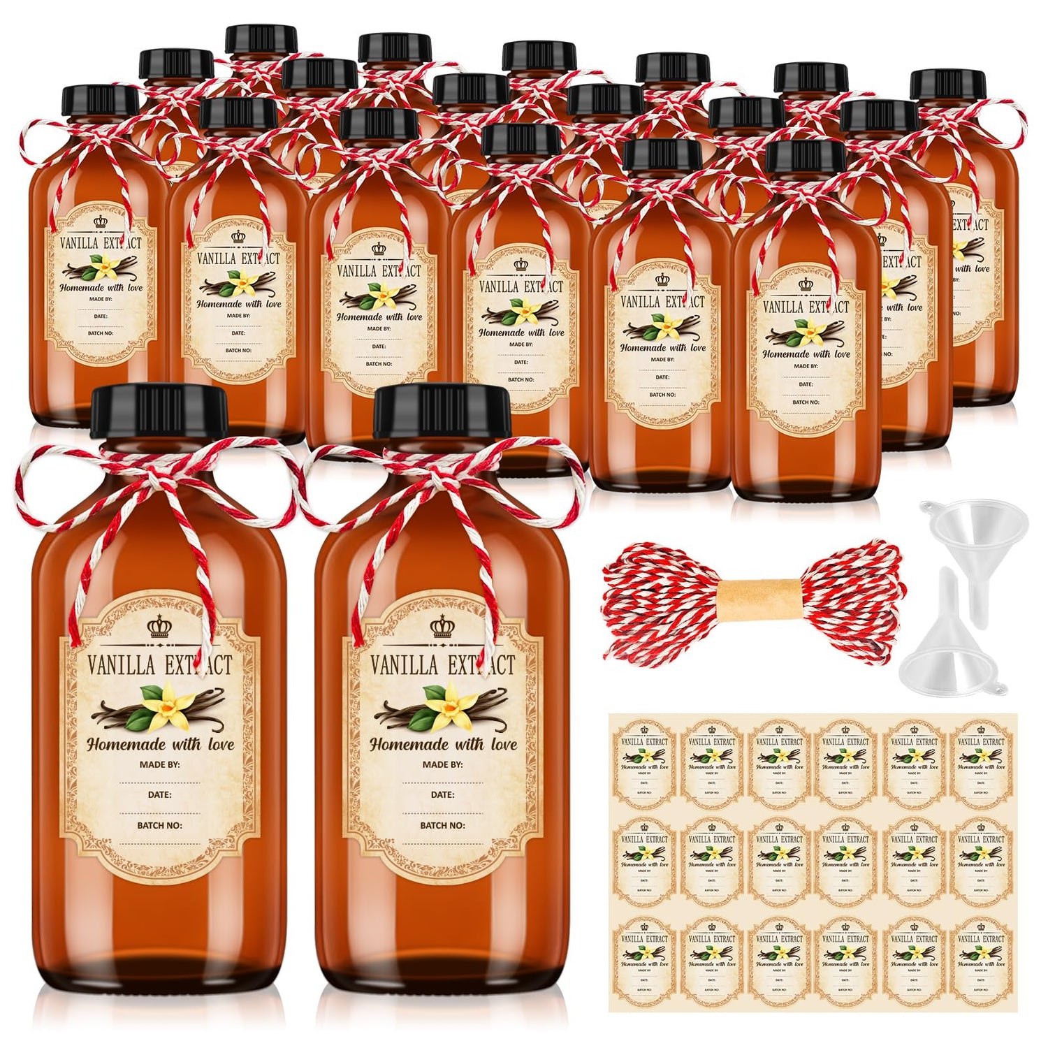 - Complete DIY Vanilla Extract Set: This set includes 18 amber glass bottles perfect as vanilla extract bottles, plus 18 stylish labels, 2 funnels, and a 20-meter red cotton rope. These brown glass bottles are ideal for homemade vanilla, essential oils, syrups, and more — great for gifting, DIY projects, and daily use.