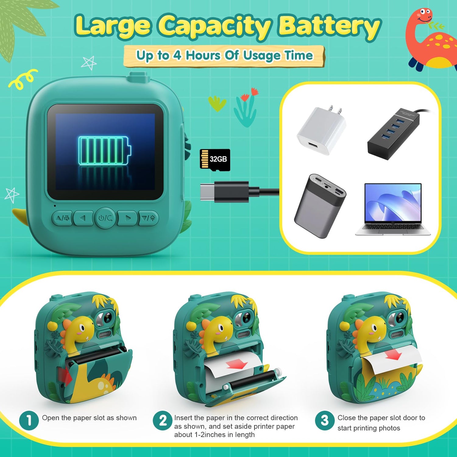 Kids Camera Instant Print, CAMCLID 2.4 Inch Screen Camera for Kids Dinosaur Children Digital Camera with 32GB Card & 3 Rolls Paper, Christmas Birthday Gift Toys for Boys Girls 3-12 Age (Green)