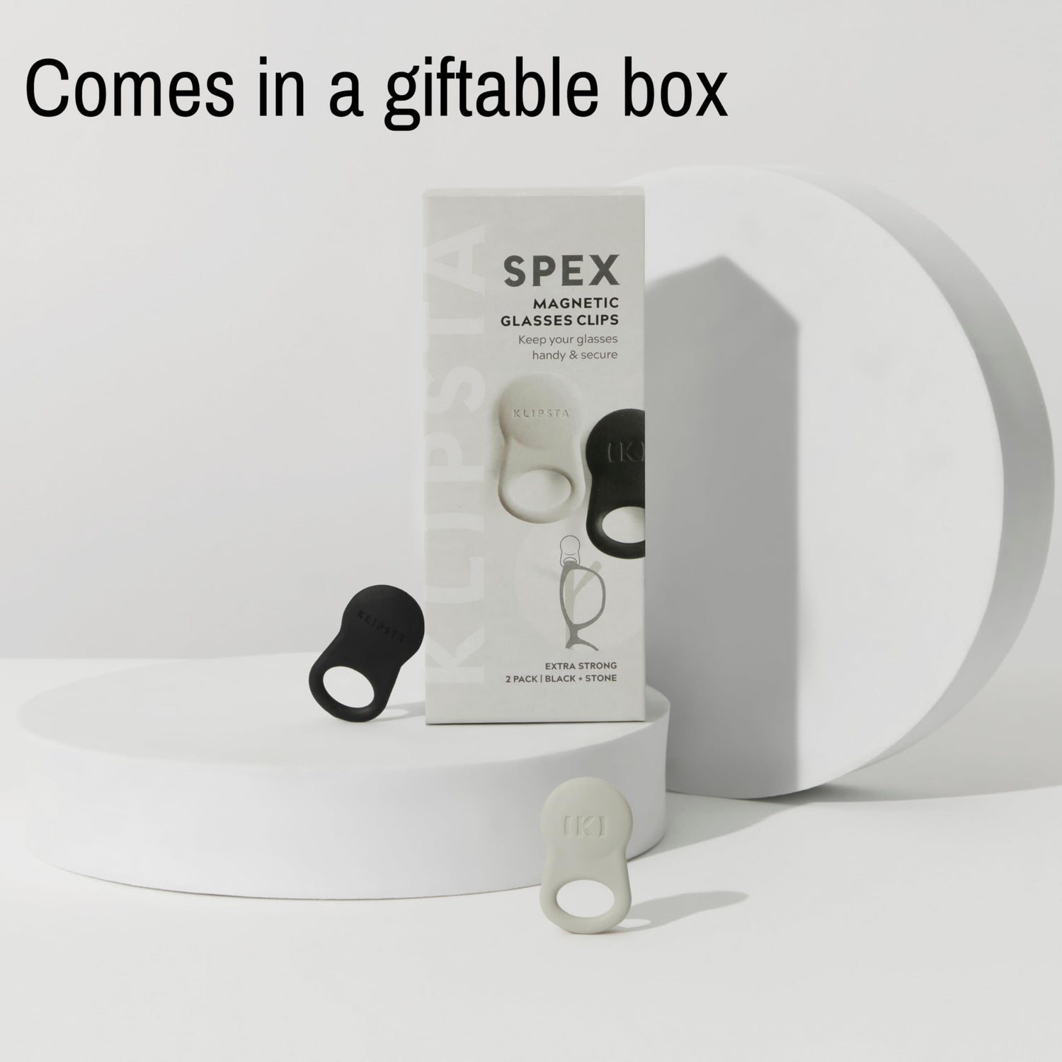 KLIPSTA SPEX Glasses Clips (Black+Stone 2-pack) - Perfect Holiday Gift & Christmas Stocking Stuffer - Magnetic Glasses Holder for Clothes, Eyewear Strap Alternative, ID Badge Holder
