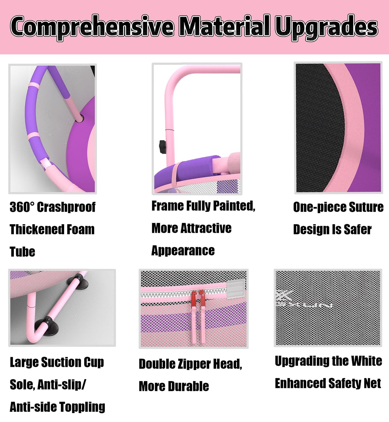 - [SAFETY UPGRADE] LANGXUN 60-Inch Mini Kids Trampoline features a baby fence-style frame structure, a new generation of thickened and heightened safety net with 360° surrounding thick safety foam tubes. The stitched jump mat and protective pad design prevent contact with the springs, ensuring children's foot safety. The large suction cups on the feet firmly grip the ground, providing added stability during play. Suitable for children aged 1 to 8.