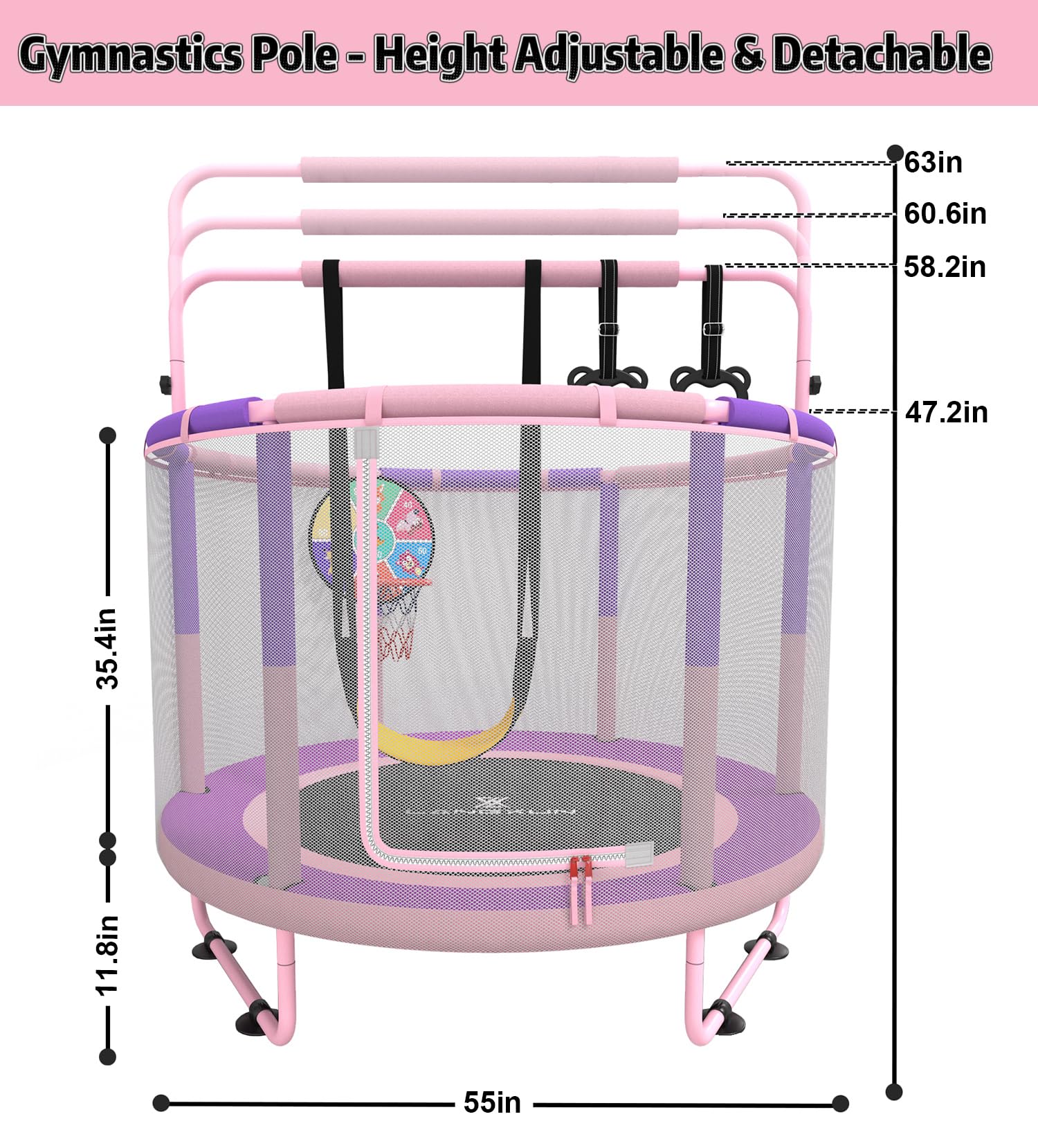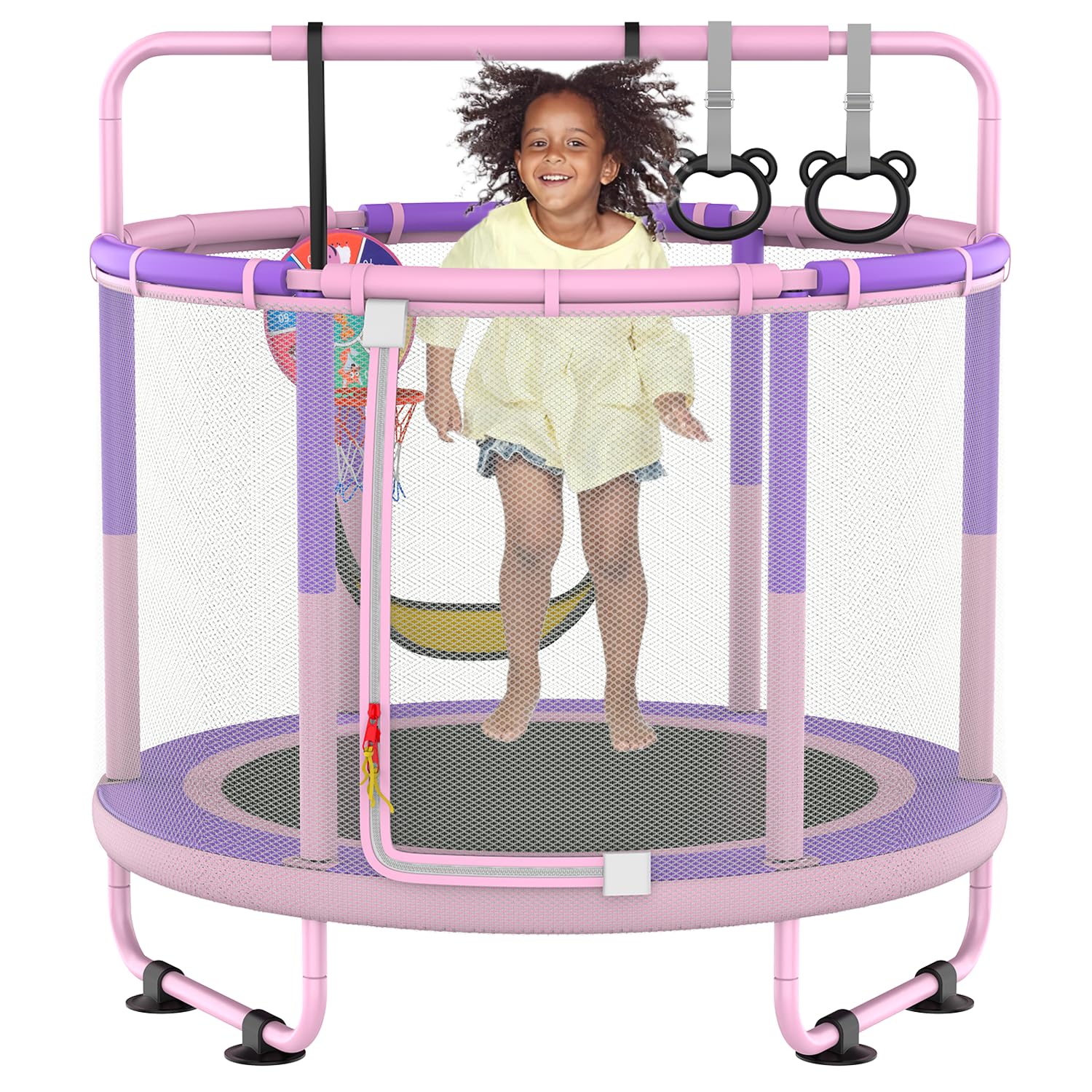 - [6-IN-1 MULTIFUNCTIONAL TRAMPOLINE] This trampoline not only provides jumping fun but also includes a basketball hoop, children's dartboard, swing, rings, and a gymnastics horizontal bar with three adjustable heights. It can also be used as a private safety house and tent for children. Let kids play to their hearts' content all day long. Suitable for indoor and outdoor use.