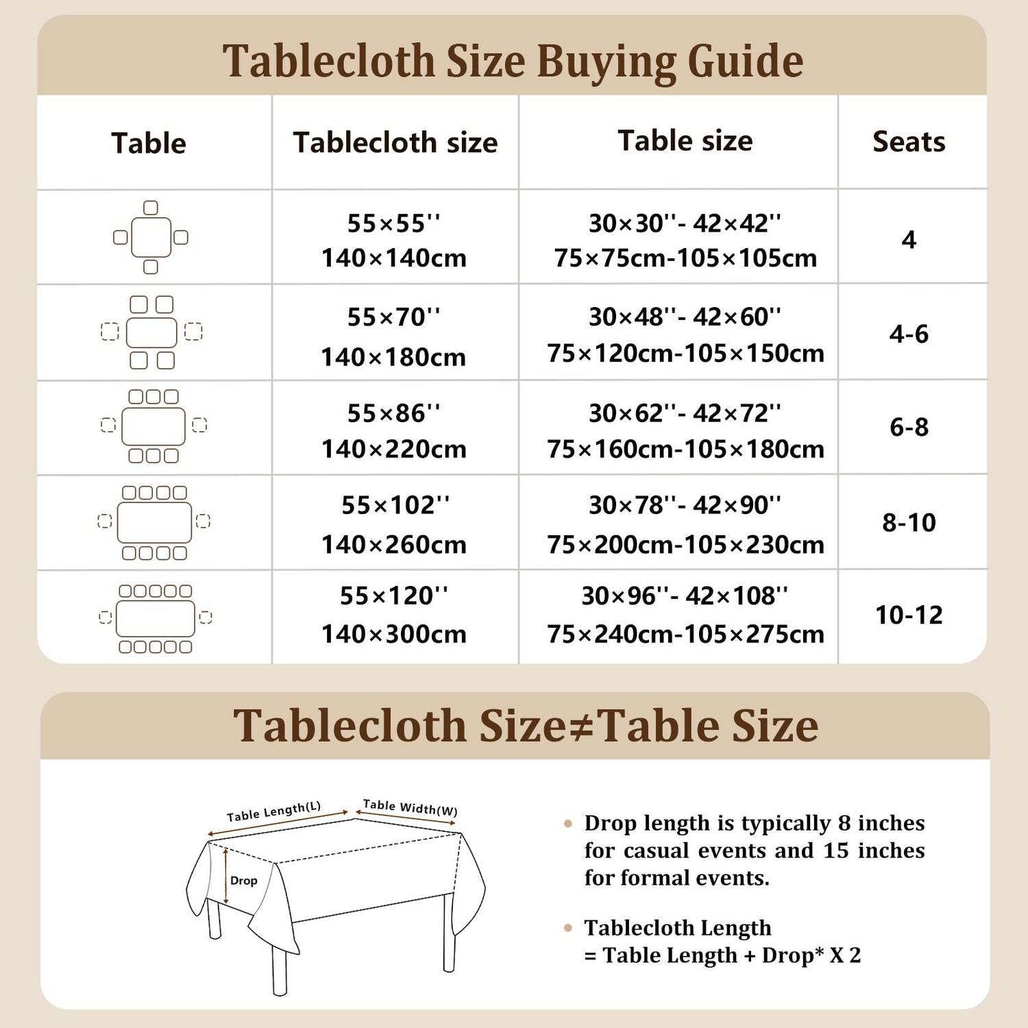 - Choose a tablecloth: Measure the size of the table, it is recommended to increase the table length by more than 20 inches (10 inches on one side) to get a better drop effect. For any size and quality issues, please feel free to contact us. We promise to help you solve your problem within 24 hours