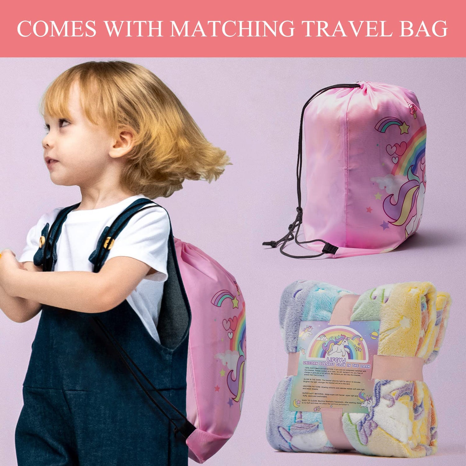 - Unicorns Gifts for Girls: As a unique gifts for girls kids, the glow in the dark cute stuff rainbow blanket can light up the stars at night for teen girls kids, whether it's birthday, Christmas, Halloween, Easter, Thanksgiving, or any other unicorn party supplies come surprise. It's also girls toys 8-10 years old. Soft unicorn blanket with pink unicorn travel bag is undoubtedly the best cool things partner for camping, gathering, and picnics