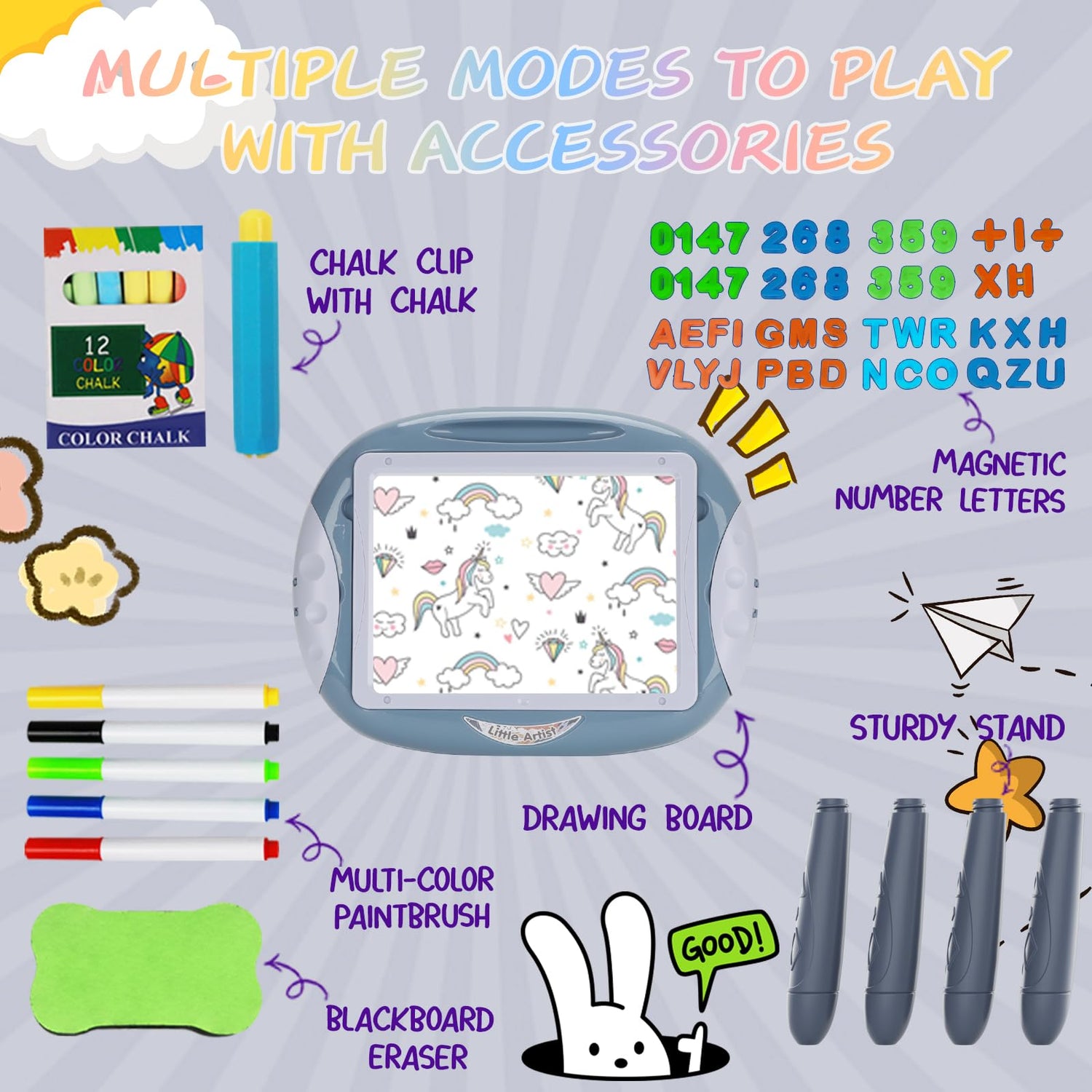 - šØćRich Creative Accessoriesć- Comes with 1 chalk holder, 1 blackboard eraser, 5 colored pens, 12 chalks, 25 number templates and 26 English letter templates. kids can use these accessories to study and draw, and the interior and sides of the graffiti table also provide space to store accessories, making drawing more convenient.