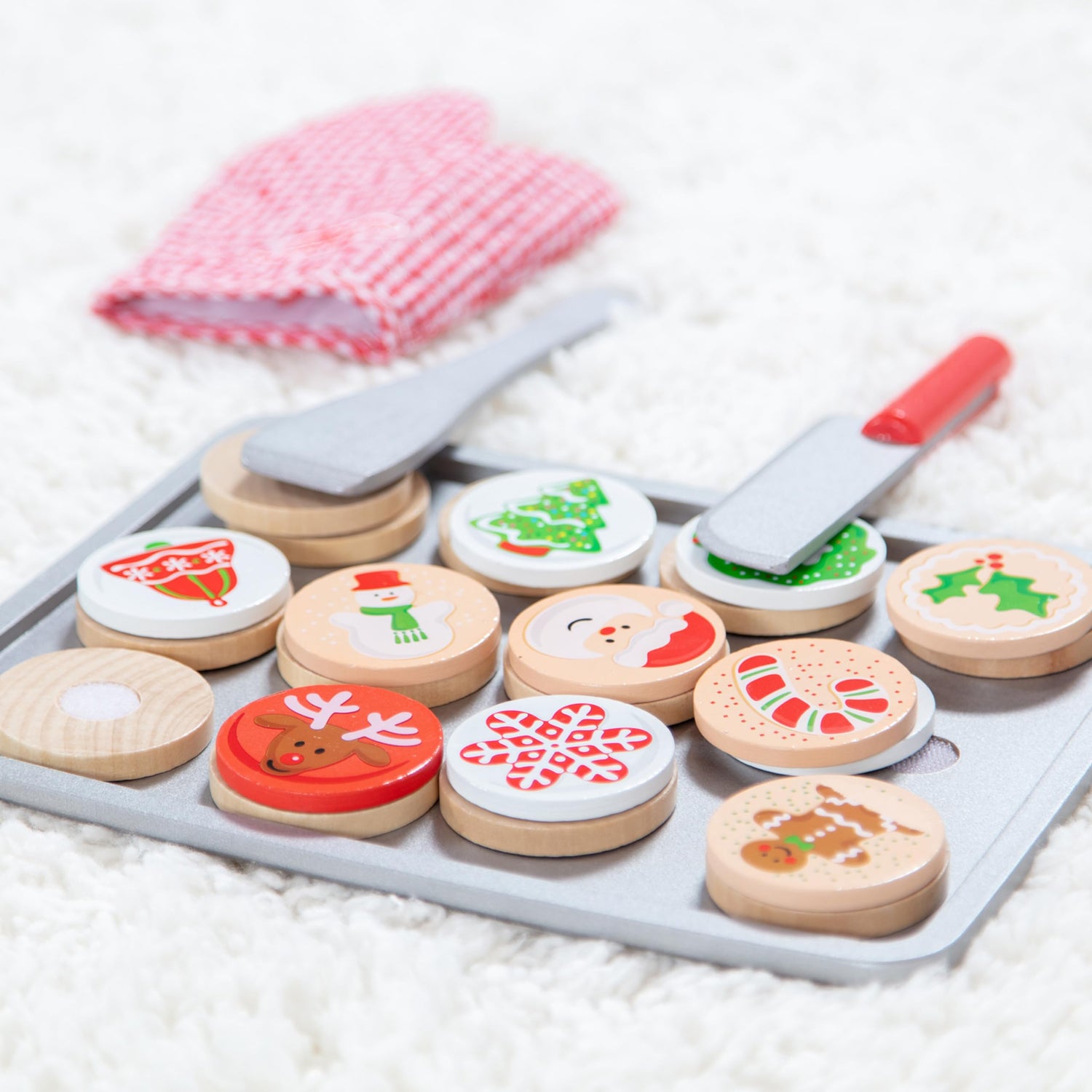 Slice and "bake" a dozen wooden cookies, then decorate them for Christmas! This colorful play-food set includes a tube of 12 sliceable cookies with 12 decorative toppings, an oven mitt, wooden cookie sheet, knife, and spatula, plus "baking" directions to encourage unlimited imaginative play and learning. It's a festive way to reinforce basic skills, encourage creativity and celebrate the holidays!