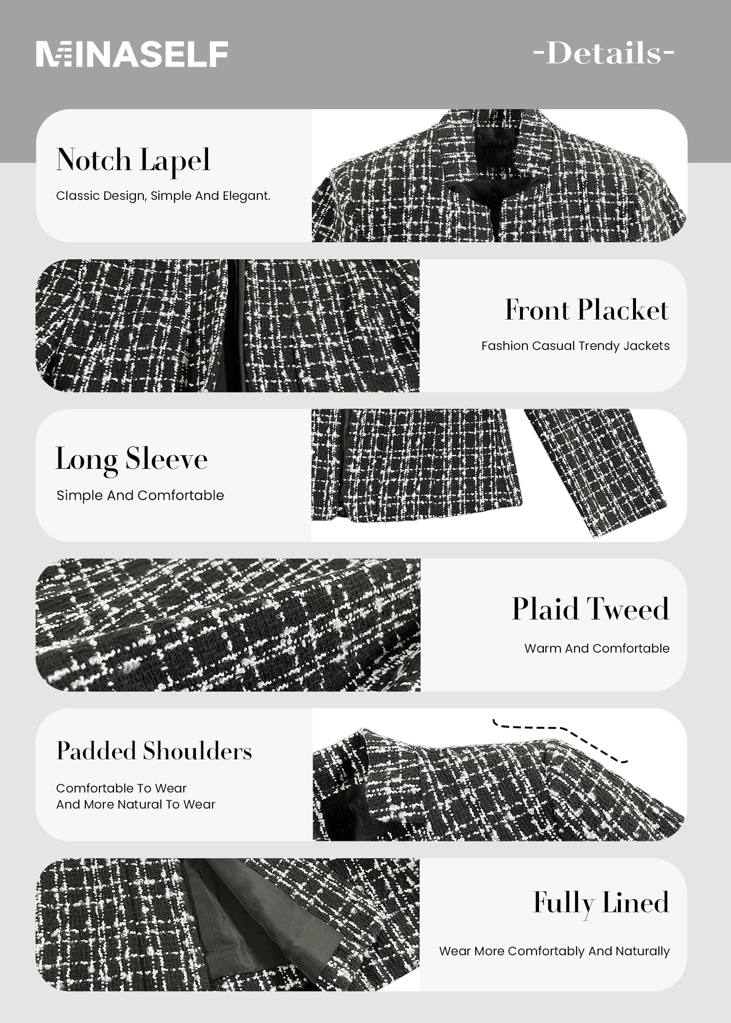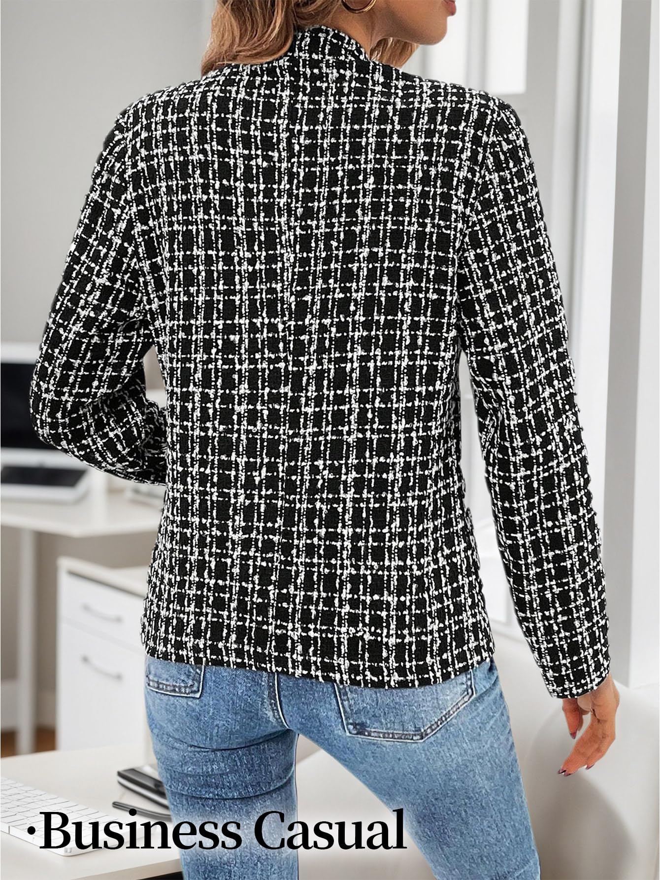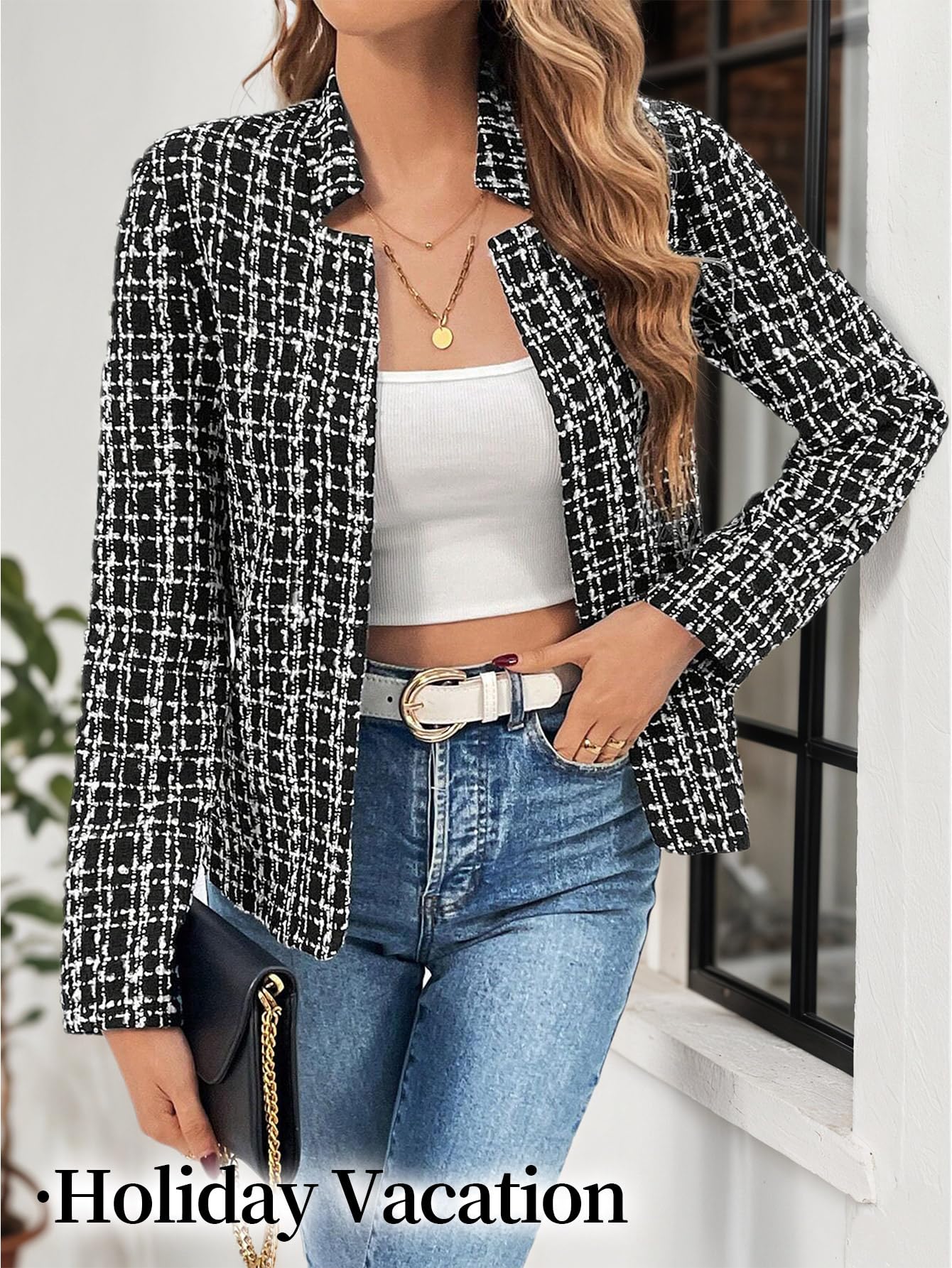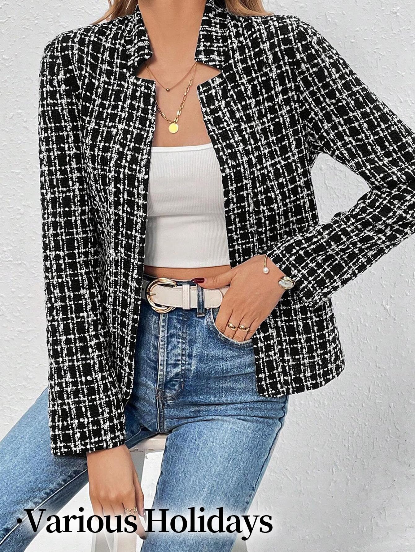 • Elegant Design for Professional & Casual Wear: Featuring a classic plaid pattern(solid), notched lapel collar, and open-front design, this long-sleeve tweed blazer accentuates your waist and shoulders for a polished, structured look. Ideal for business casual outfits, it effortlessly transitions from office meetings to semi-formal events.