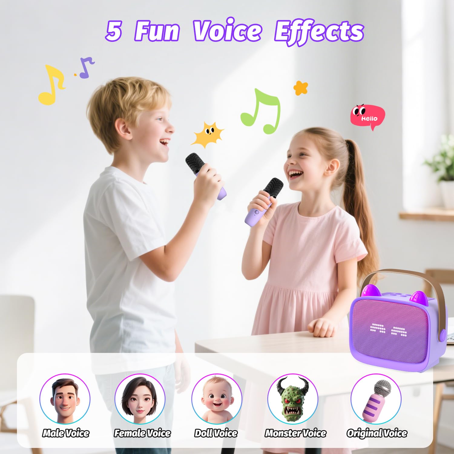 • 【High-Quality Sound】This portable karaoke machine comes with 2 wirelessly synchronized microphones, featuring one-tap original vocal removal and 4 fun voice-changing effects. Equipped with a built-in DSP chip for vocal enhancement and dual noise reduction, the Bluetooth speaker delivers crystal-clear, 360° surround sound.
