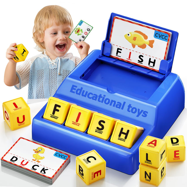- [Parent-Child Interaction & Learning Fun]: "Mommy, I learned a new word, F-I-S-H fish!" This game encourages bonding while teaching kids new words. The neatly stored letter cubes in the tray base and organized cards make it easy to set up and play, promoting both learning and family time. A great 3 year old boy birthday gift or 4 year old boy birthday gift, it makes learning engaging and interactive. Supports multiplayer spelling competitions, making it a hit at parties and family gatherings.
