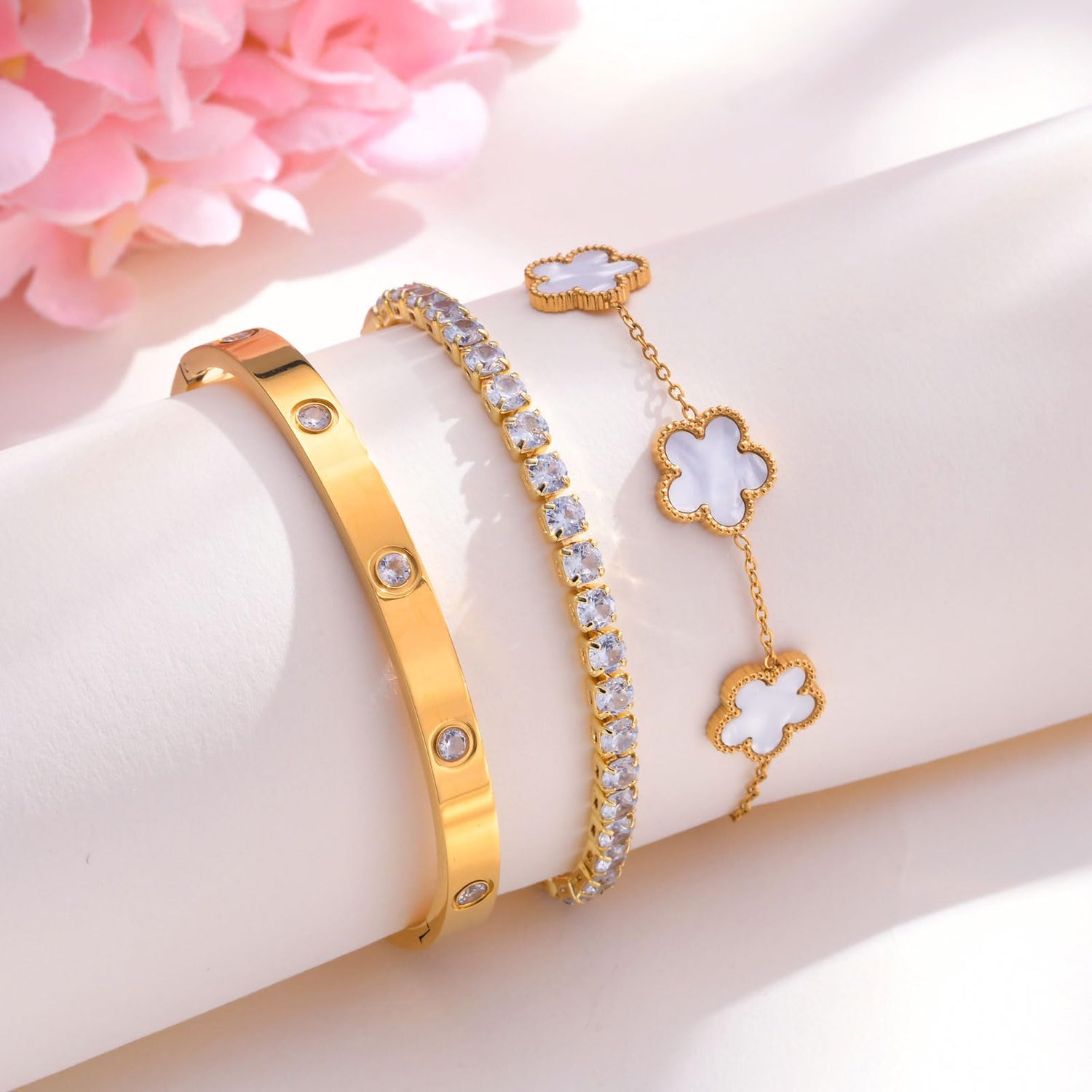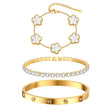 MPRAINBOW 18K Gold Plated Stainless Steel Womens Stackable Floral Bracelet Set, Bangle Chain Non Tarnish, Trendy Jewelry Gifts for Girlfriend, Christmas, Valentines, Birthday, White, 3Pcs