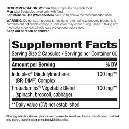 Details: DIM-plus contains diindolylmethane, a phytonutrient found in cruciferous vegetables including broccoli, Brussels sprouts, cabbage, cauliflower and kale. Diindolylmethane has unique benefits that support the activity of enzymes that improve estrogen metabolism. Research shows diindolylmethane increases the level of "favorable" estrogens (2-hydroxyestrogen) while reducing the level of "less favorable" estrogens (16-hydroxyestrogen). DIM-plus Difference Contains Indolplex BR-DIM Complex—an enhanced bioavailability delivery system for diindolylmethane. Enhanced Absorption The bioavailability of DIM-plus is superior to regular diindolylmethane and its unstable precursor, indole-3-carbinol (I3C). With DIM-plus you are assured a stabilized and consistent dose of diindolylmethane. Protectamins Vegetables DIM-plus also contains spinach, cabbage and broccoli for additional phytonutrients. Suggested use Women take 2 capsules daily with food. Men take 2 capsules twice daily with food. For Intensive Use (Women/Men): take up to double the recommended dose. Other ingredients Cellulose, plant-derived capsule (hypromellose, titanium dioxide color), modified food starch, tocophersolan, phosphatidylcholine, silica. No sugar, salt, wheat, yeast, dairy products, artificial flavors, or preservatives.