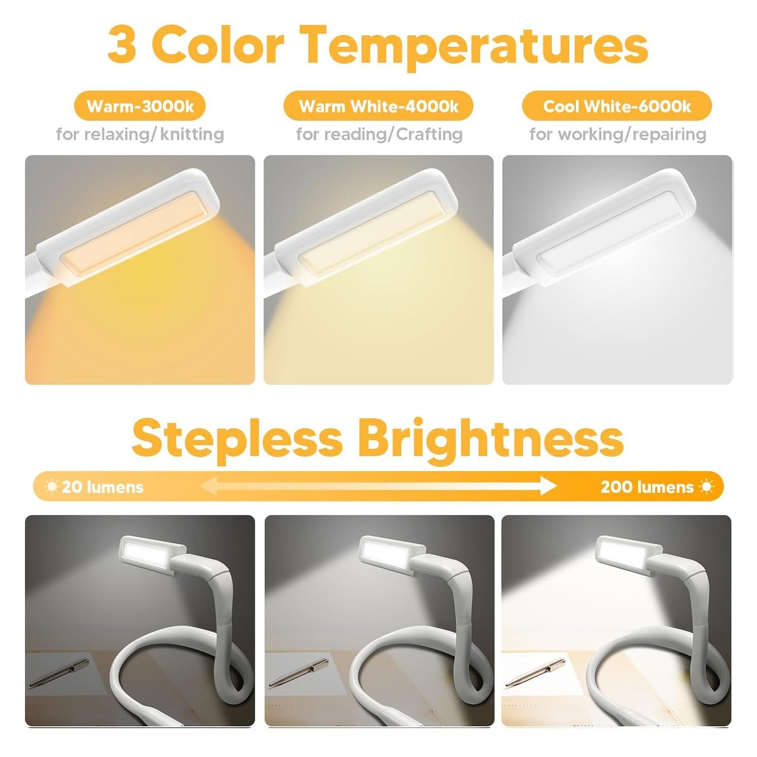 - Adjustable Brightness and Color Temperatures: The EastPin reading light offers stepless dimming and three color temperature options: warm white (3000K) for relaxation, neutral white (4000K) for crafts or reading, and cool white (6000K) for detailed work