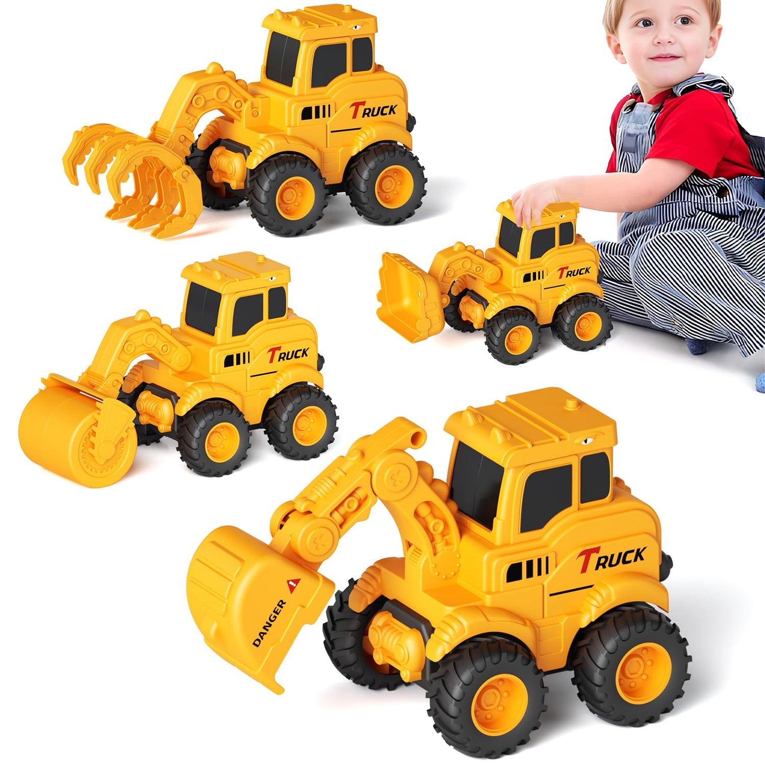 • KIDS CONSTRUCTION TRUCK TOYS SET - The package includes 4 construction vehicles: excavator toy, bulldozer, road roller, timber grab vehicle. The arms of the construction toy cars can move up and down, and each joint is flexible, making 'KaKa' sounds. Great toys for any truck lover. Truck size:Excavator Toy: 8.5 x 3.7 x 4.7 inches, Bulldozer: 6.5 x 3.7 x 4.7 inches, Road Roller: 7.3 x 3.7 x 4.7 inches, Timber Grab Vehicle: 7.8 x 3.7 x 4.7 inches