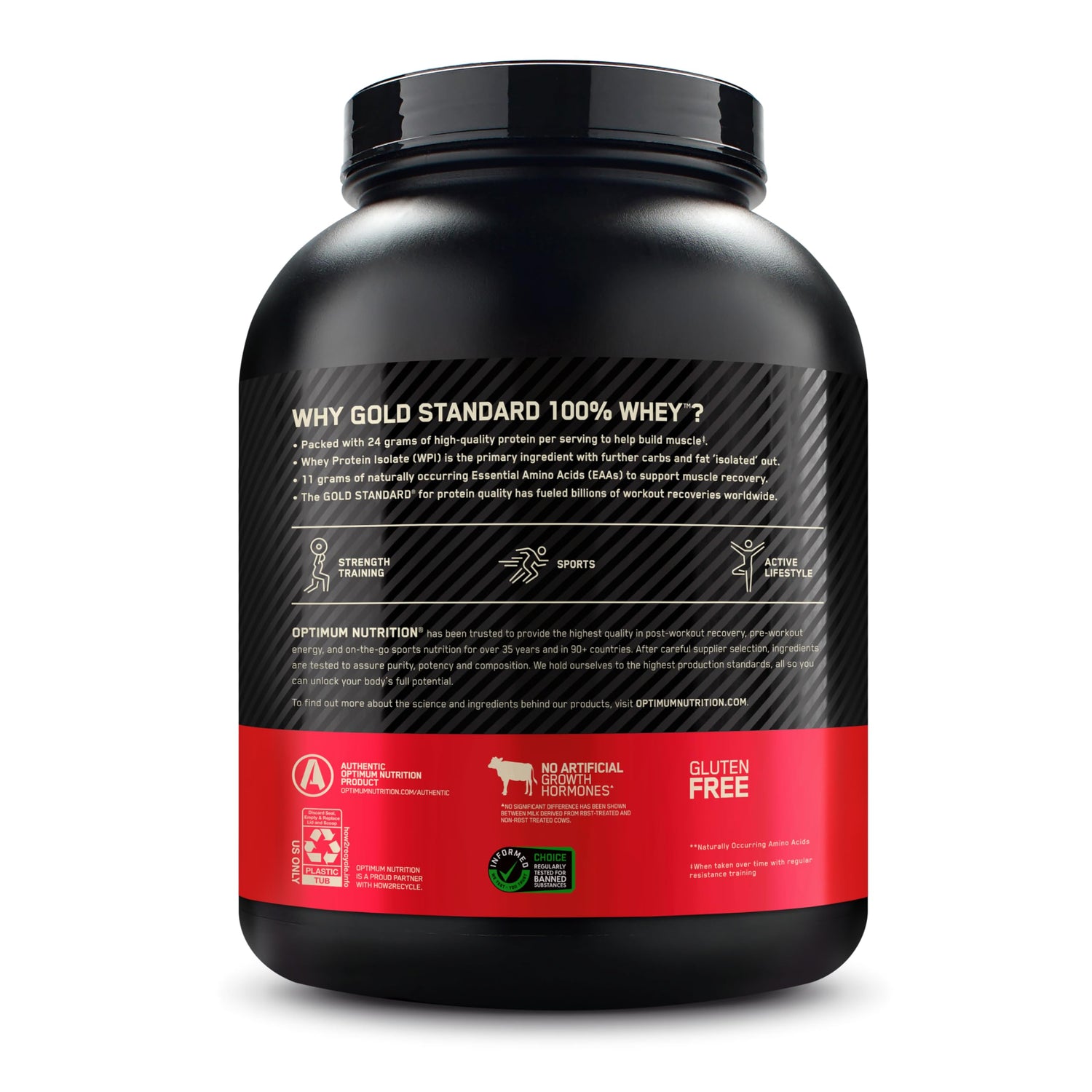 Details: Optimum Nutrition Gold Standard 100% Whey Protein Powder helps build and maintain muscle mass when taken regularly and combined with strength training exercise. Made with whey protein isolate as the primary ingredient, this protein supplement powder ensures that you're getting high quality protein with every serving. The hydrolyzed whey protein powder isolate creates a post-workout drink mix that supports muscle recovery. Each serving of this delicious powder provides 24 grams of all whey protein, along with 11.4 grams of naturally occurring essential amino acids (EAAs) to support after workout muscle recovery. Optimum Nutrition protein powder mixes easily using a shaker cup or blended in a smoothie. Gold Standard 100% Whey has fueled billions of workout recoveries worldwide.