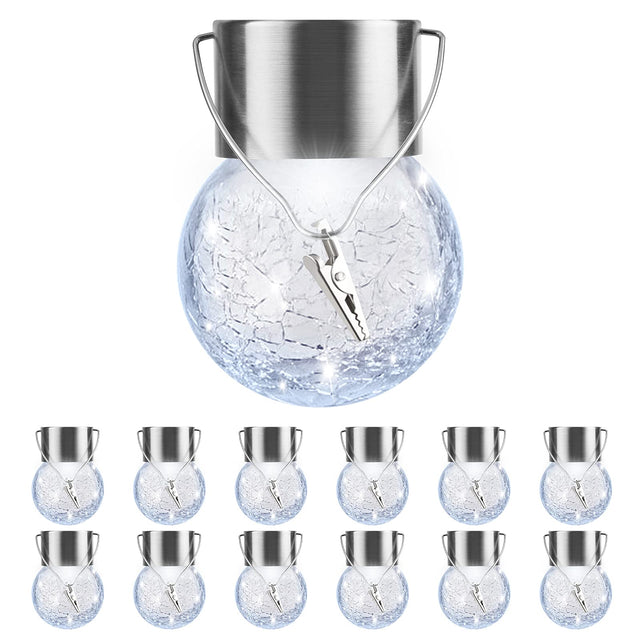 PARTPHONER 12 Pack Hanging Solar Lights Outdoor, Waterproof Solar Globe Lantern with Handle and Clip, Decorative Cracked Glass Ball Lights for Christmas Decor, Tree, Yard, Garden, Patio (Cold White)