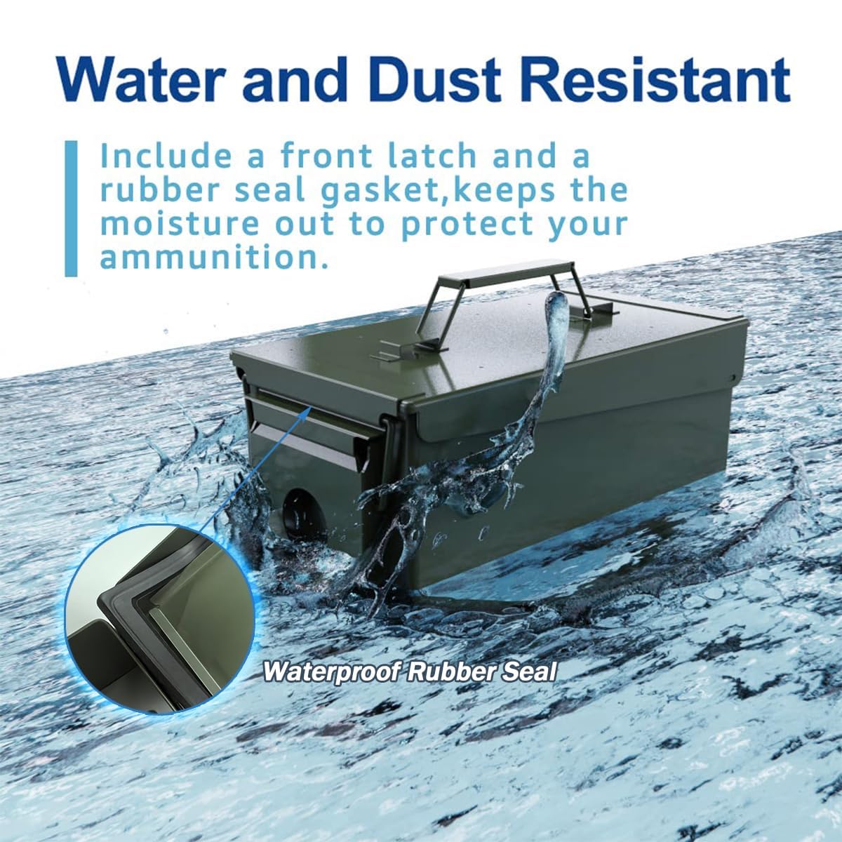 - ✅【Airtight & Waterproof Seal】Designed with a front latch and rubber seal gasket, this ammo box is both air and water-tight. The airtight seal prevents moisture from entering, while the water-resistant construction keeps your ammunition safe and dry, prolonging its shelf life.We also provide a desiccant pack to absorb any moisture accumulated in the sealed ammunition canister, keeping your items dry.