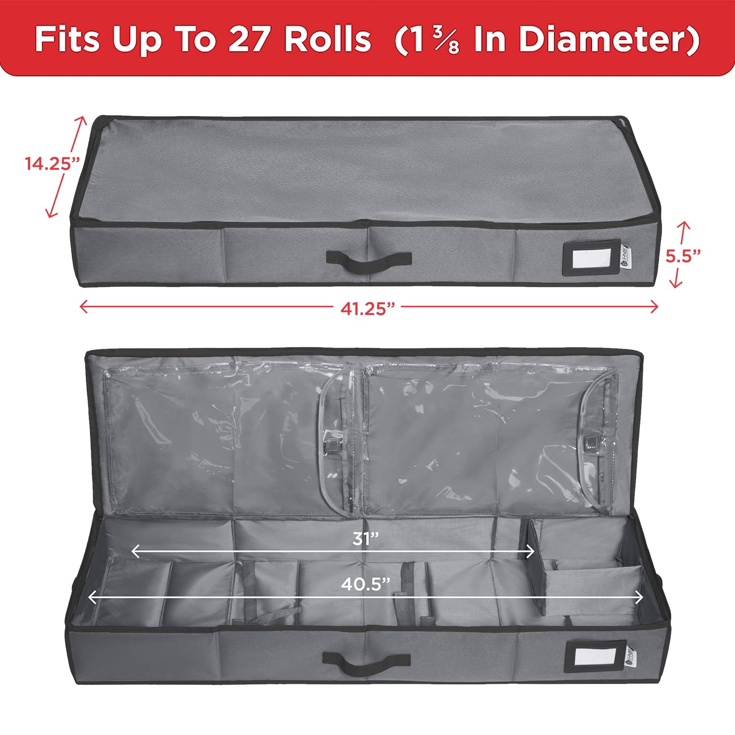 - SPACIOUS DESIGN: Accommodates up to 27 rolls of wrapping paper with a 1 3/8" diameter & up to 40” long. Also has Internal Pockets dedicated for Tags, Ribbons, Bows and more. Total measure is 41.25”W x 14.25”L x 5.5”H to keep everything tidy and organized.