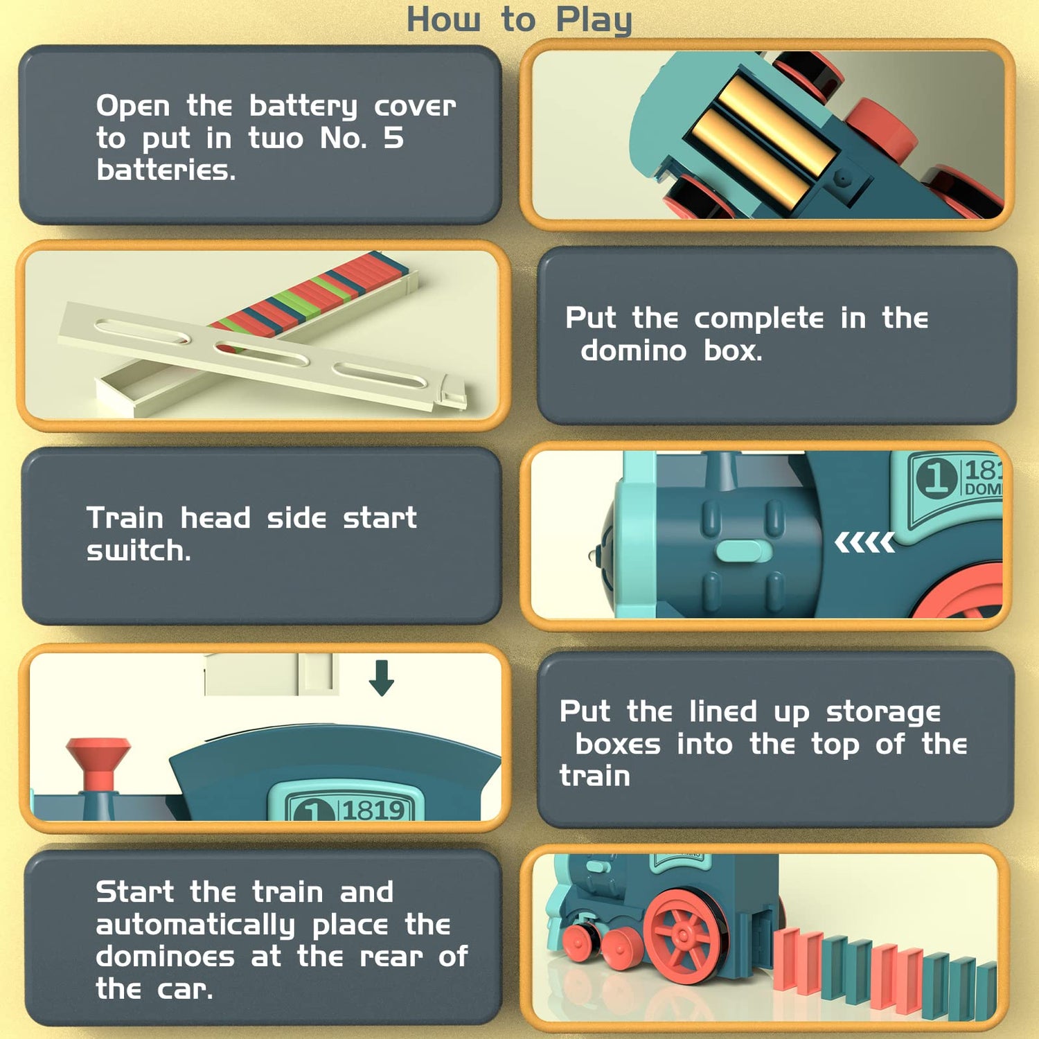 • Let's play domino: As the first domino rally for toddler, it's a very creative and fun toy to play domino that automatically stacking dominoes. Putting dominos into the trains slot and with a press of button, you're off! The electronic locomotive has a light that blinks, and has some cool train sounds when it moves. By turning the train converter in the direction you want the dominoes to be placed, it allows your child to easily set and push the dominoes down with minimal effort.