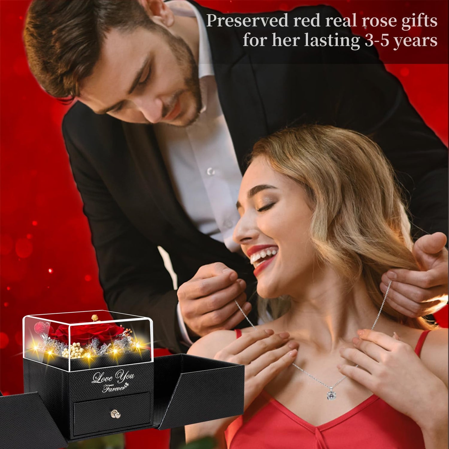 - ⤠ć Preserved Rose with NecklacećUnique double heart-shaped structure and is engraved with " I LOVE YOU necklace 100 Languages " to express love to her. The two hearts are tightly intertwined, symbolizing the love for each other and it will be an exclusive gift for her.The i love you necklace on hidden inside bottom of the rose box, as a romantic gifts for her, Unique design of double love "I LOVE YOU necklace" and gift box preserved rose, gift Ideas for women for every romantic occasion.