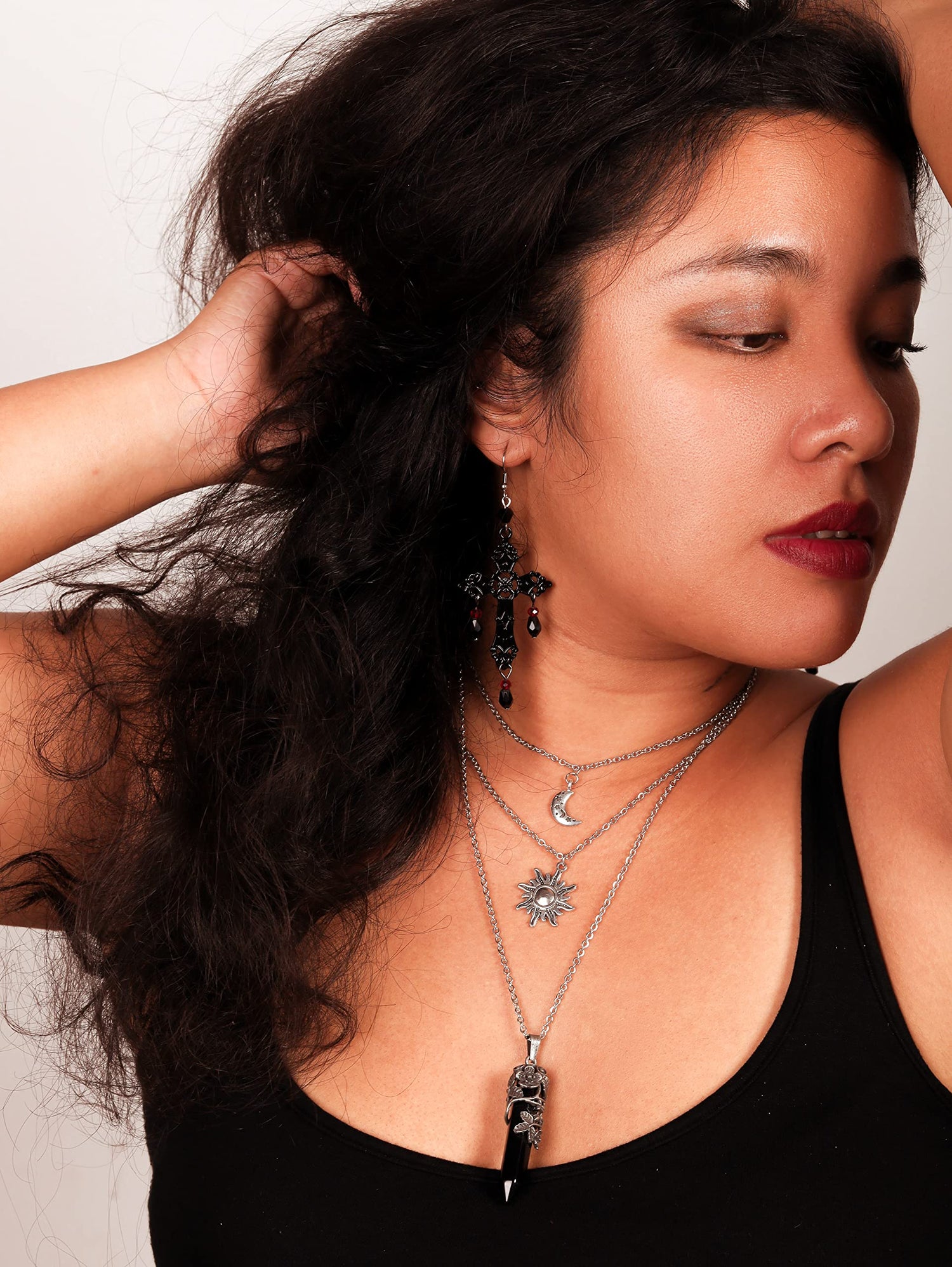 - GOTHIC GOTH GRUNGE LAYERED SUN MOON CRYSTAL NECKLACE:Our Goth Layered Sun Moon Crystal necklaces go with most everyday outfits and look great with boho and punk clothing and can be used as a Halloween or Valentine's Day costume.