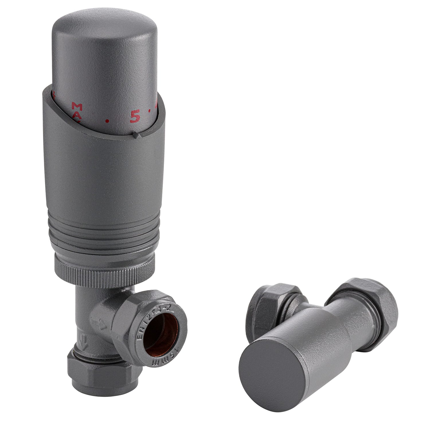 Sandy Beach Anthracite Radiator Valves, Grey Radiator Valve Thermostatic, Anthracite TRV Radiator Valves - Grey Thermostatic Radiator Valve with Lockshield Valve Angled (15mm)