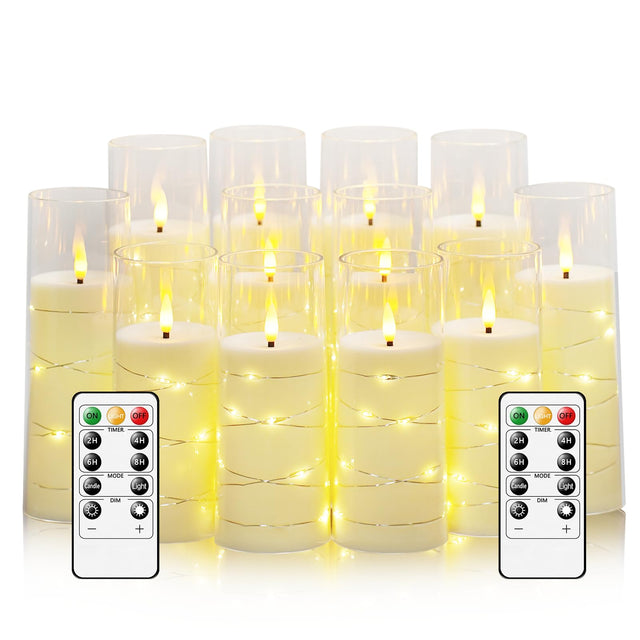 Sasigeiaa Flameless Candles with Embedded Star String - Battery Operated LED Candles, with Remote,12 Ivory Flickering Candles for Christmas, Weddings, Home Decor & Party,(D 2.3"×H 5" 6" 7")