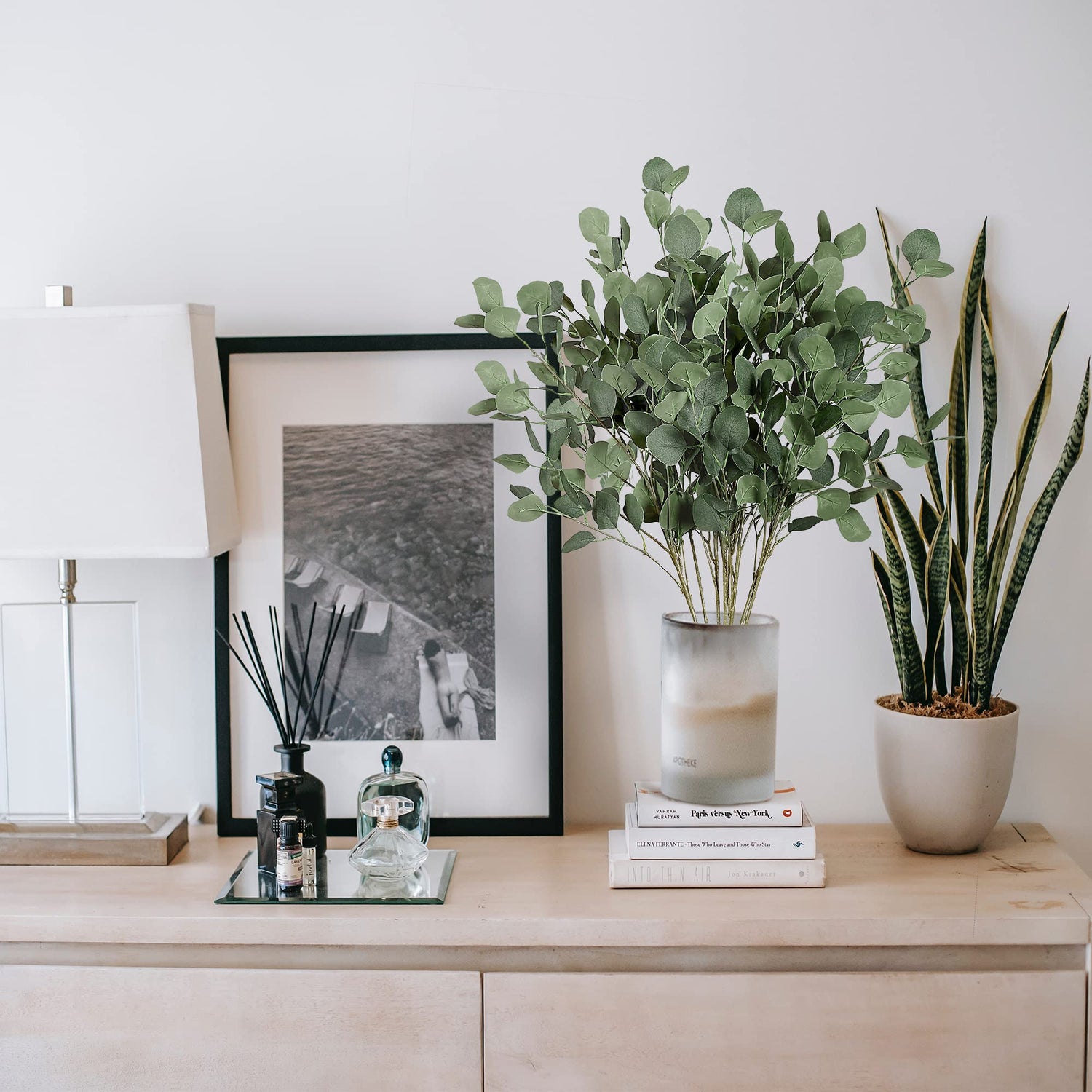 - WIDELY APPLICATION: You can mix these fake silk eucalyptus with other element. They are suitable for vase arrangements on table centerpieces,bookshelves, bedrooms,bouquets for weddings and celebrations,also a great gift for your friends and family,bringing them happiness during festivals, and expressing your love and blessing at the same time.