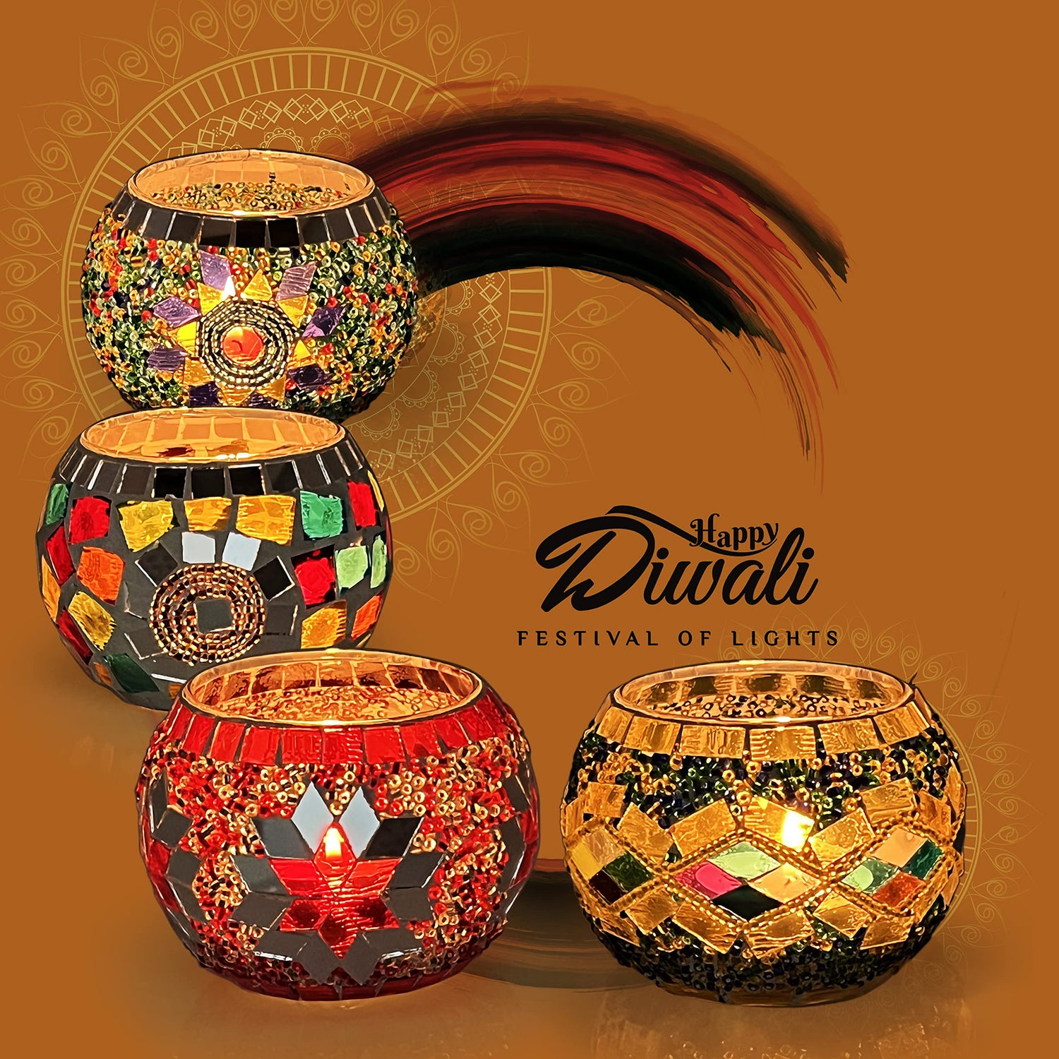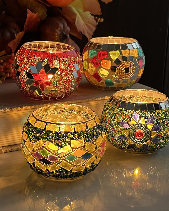 - Mosaic Candle Holder: Includes 4pcs mosaic glass candle holders in 4 colors: Red, Green, Blue, and Yellow. 100% handmade with traditional crafting techniques, creating elegant festival patterns around the body
